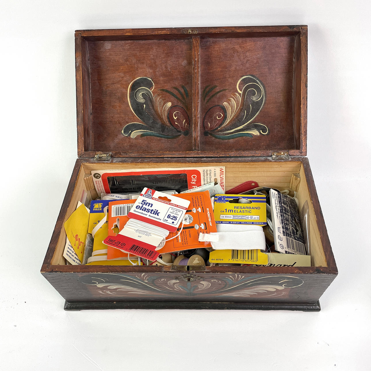 A sister box with kurbit-painting with various sewing accessories. Dimensions approx. 33 x 18 x 16 cm.