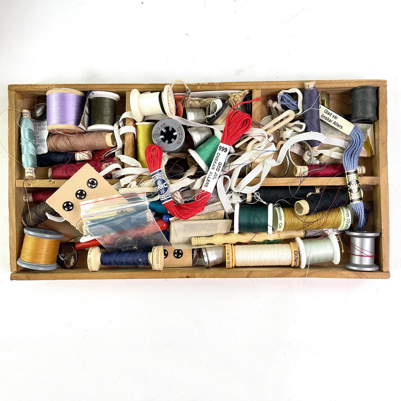 Wooden box marked “Gütermanns Sysilke, with sewing thread mostly in new condition, various colours, dimensions approx. 32 x 38 x 7,5 cm.