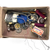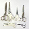 2 small baskets, several scissors, sewing kit, ribbon, lace etc.