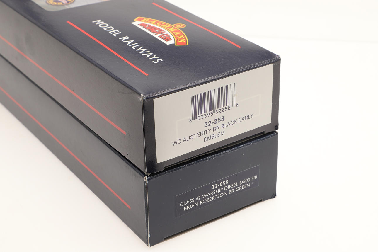 Two boxed locomotives including 32-055 Class 42 Warship Diesel Brian Robertson, and 32-258 WD Austerity. Boxes 34cms by 9cms (2).