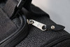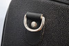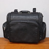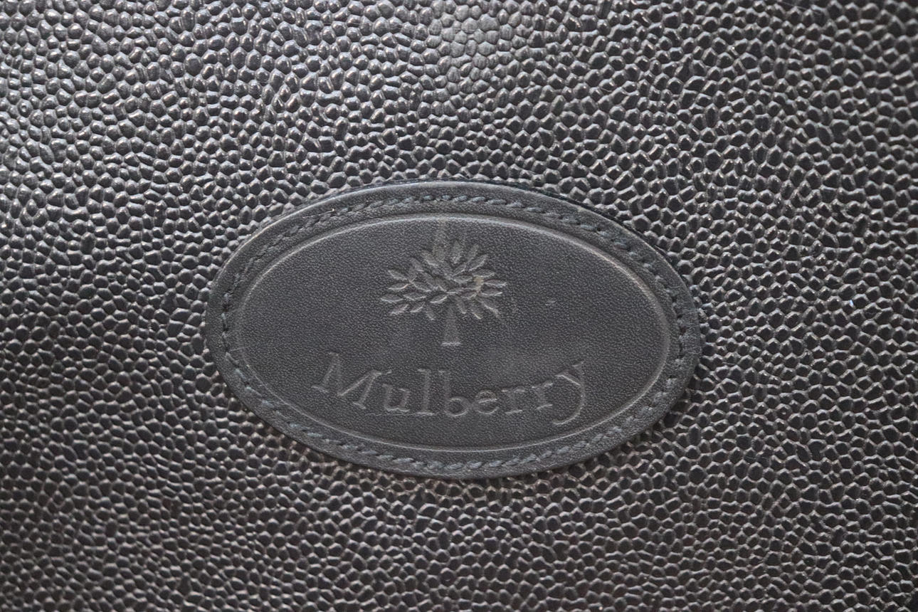 Black scotch grain with leather details, one larger and two smaller zippered outer compartments, fixed address bar, wheeled with retractable handle, lined with removable shoelace lining, marked Mulberry England,