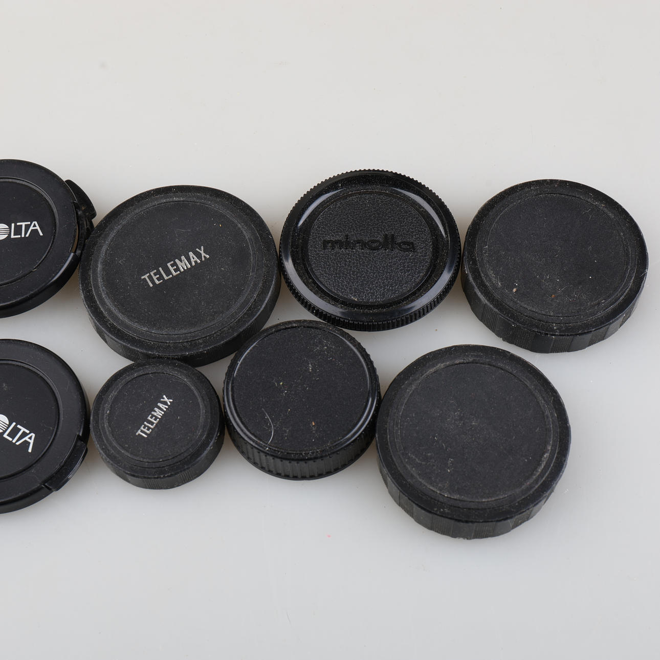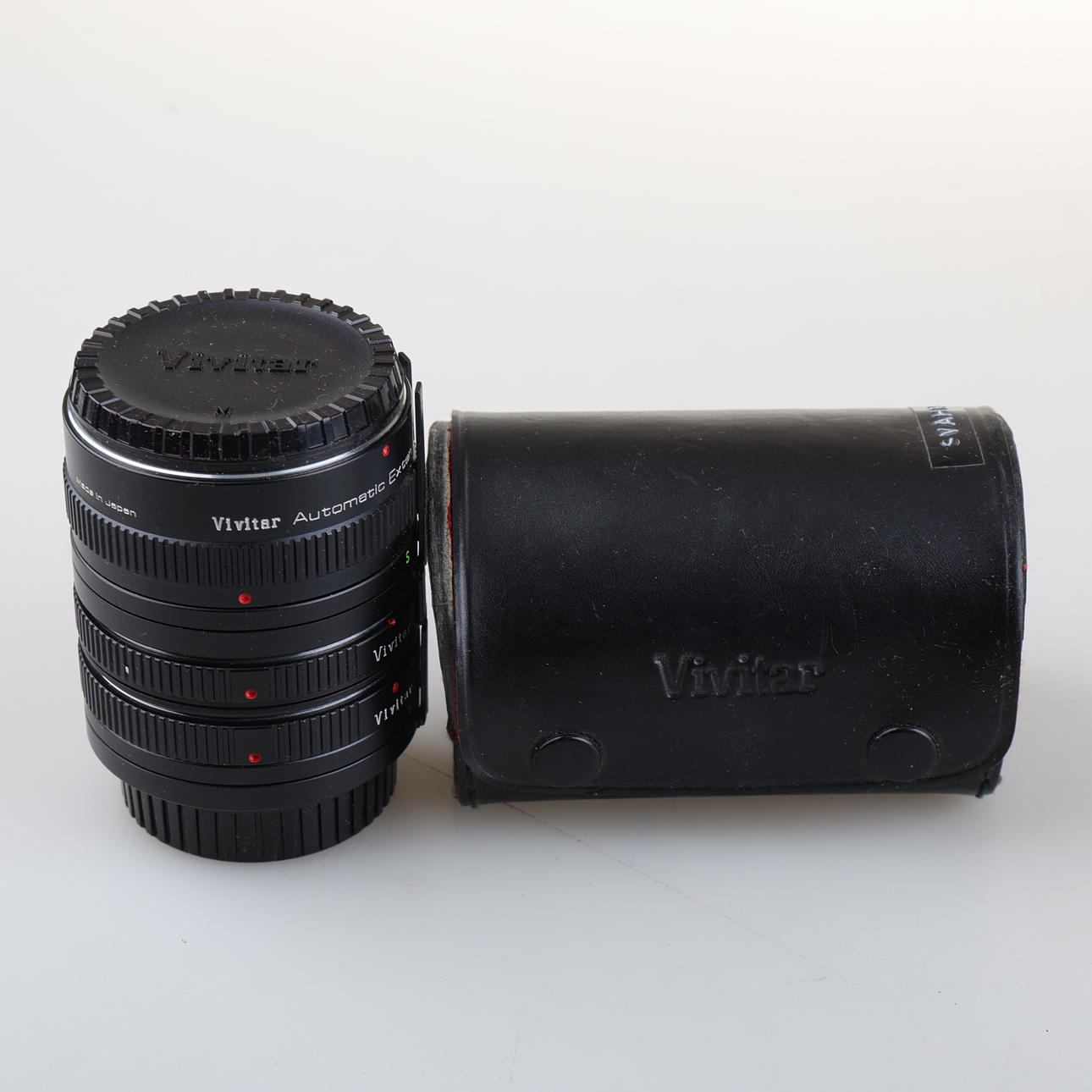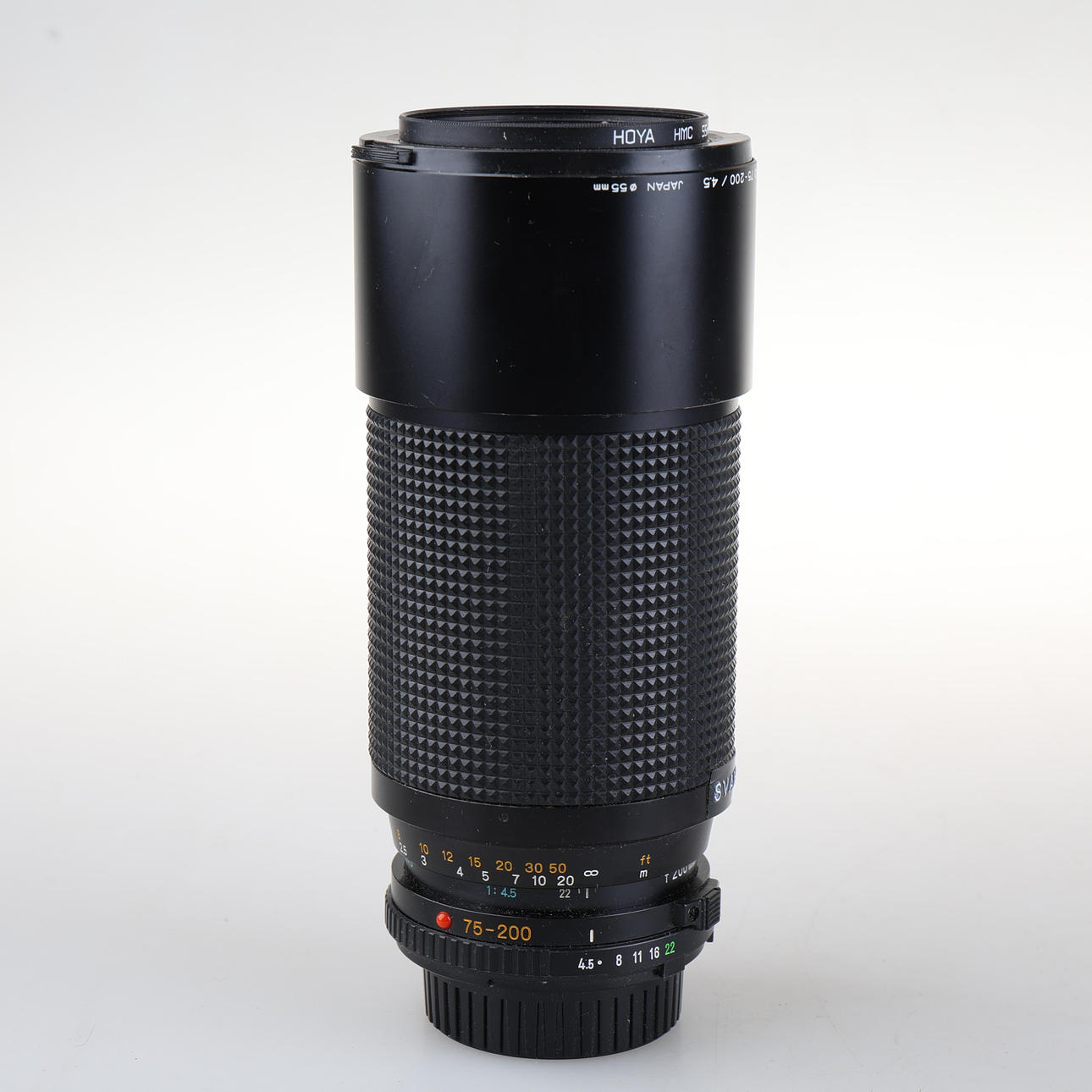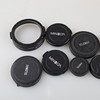 Camera XG9, approx. 8x14x10 cm. Vivitar Automatic AT-5 36mm, approx. 9cm, length. Hoya HMC 55mm, approx. 9 cm, length. Variant, Rule, 740 CTX, approx. 14x7x4.5 cm. Minolta MD75-200/4.5.