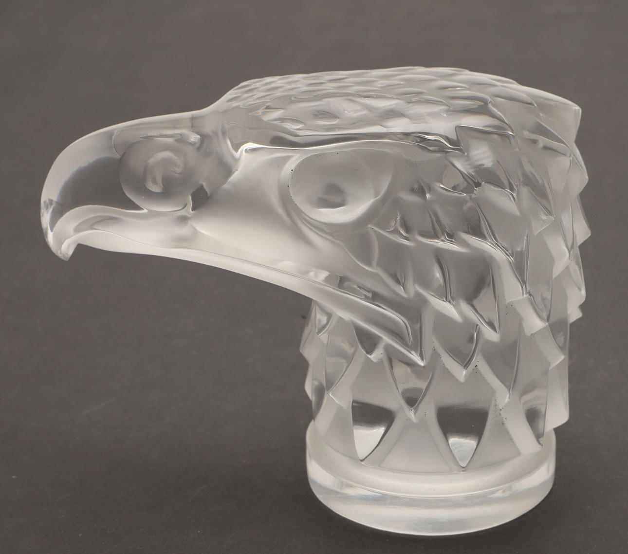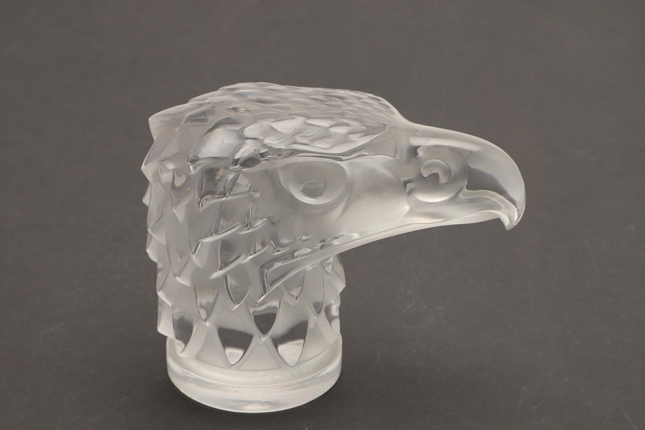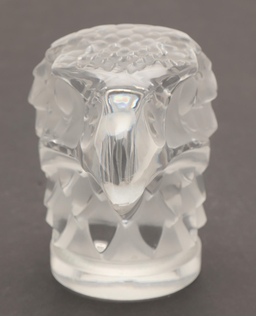 A Lalique frosted glass car mascot in the form of an Eagle's head. Etched marks to the base, 'Lalique, France'. 11cms high.