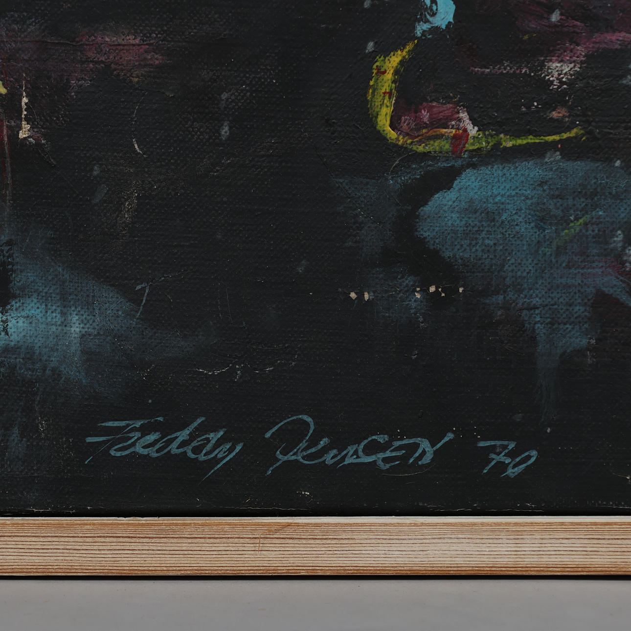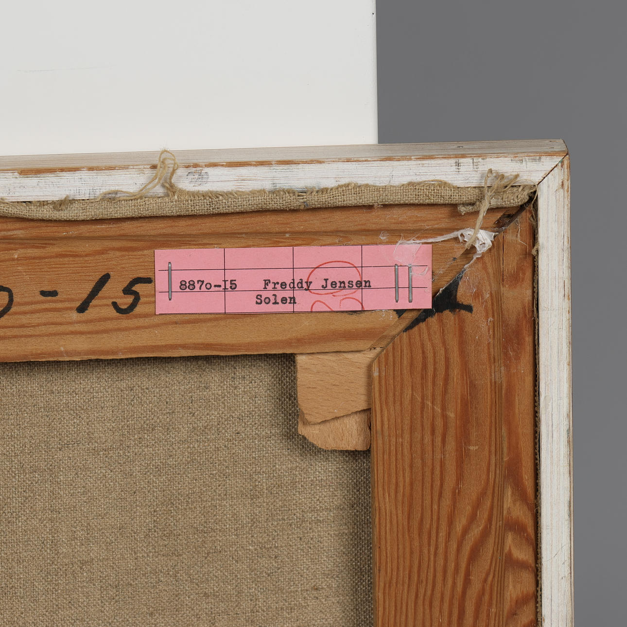 FREDDY JENSEN (1944-2018), composition oil on canvas' Solen ', signed. The exhibition label as well as signed and dated 1970 on the back. H.54x61.5 cm, framed dimensions h.57x64 cm.