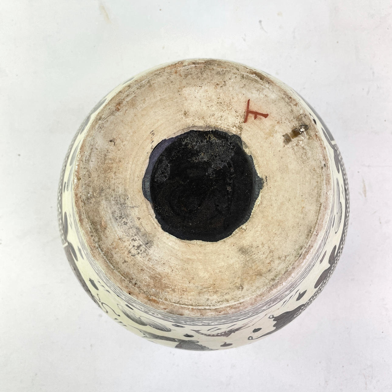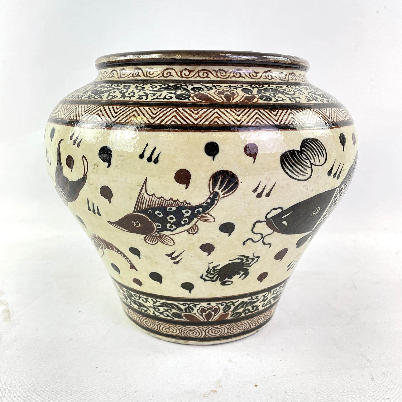With decor of fish and seafood. Height ca 23,5 cm, diam ca 28 cm.