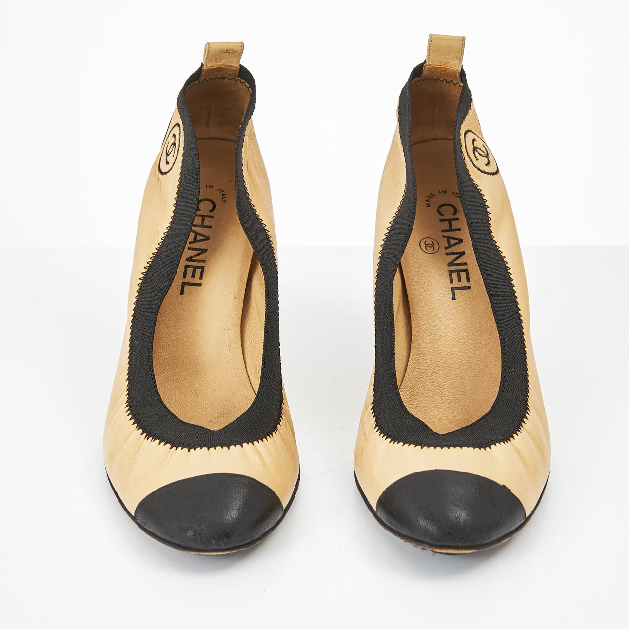 In light nappa leather, black leather toe and heel, elastic band around opening, with CC, marked “Chanel made in Italy”, size 40, heel height approx. 7-9 cm.
