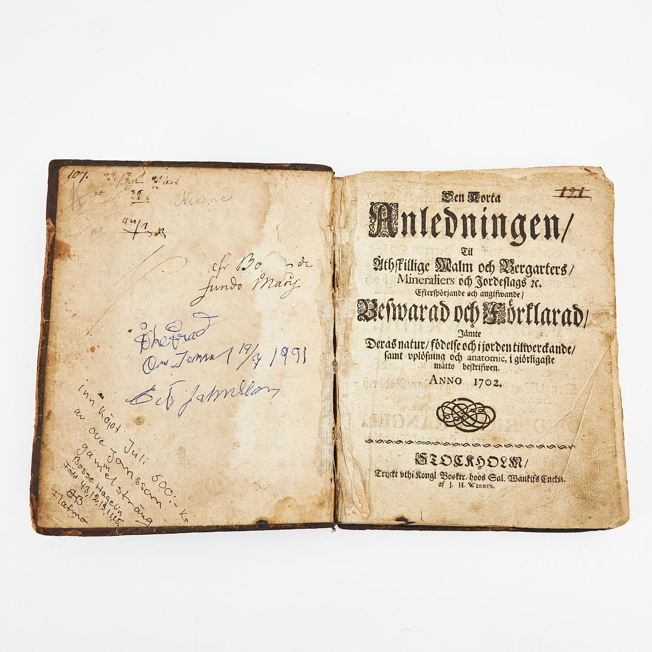 HIÄRNE, URBAN. The short reason for eithnumerous Ore and Bergarters, Mineraliers and Soils etc. Searching and indicating, warned and explained, together with their nature, birth and earthly existence, and disintegration and anatomy, to the greatest extent described. Anno 1702. I-II. Stockholm, Kongl. Boktr. hoos sal. Wankif's Enckia, 1702-06.