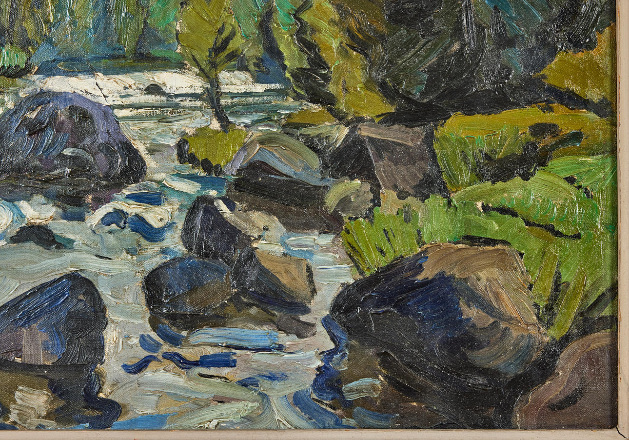Österlind's artistry is not characterized by a uniform style. His expression changed markedly over time: from the early 1910s landscapes with wide color fields, to the dramatic depictions of severe weather and autumnal landscapes of the 1920s and 30s, and on to a later phase in which he depicted sunlit villages surrounded by dense, verdant vegetation.