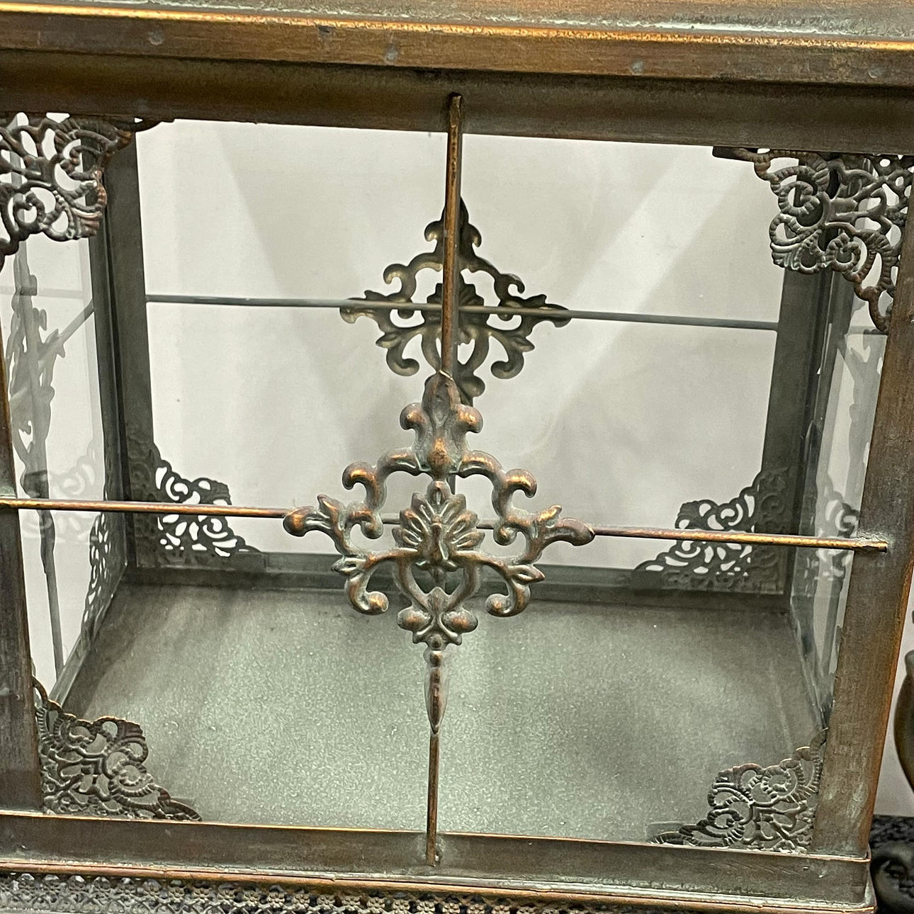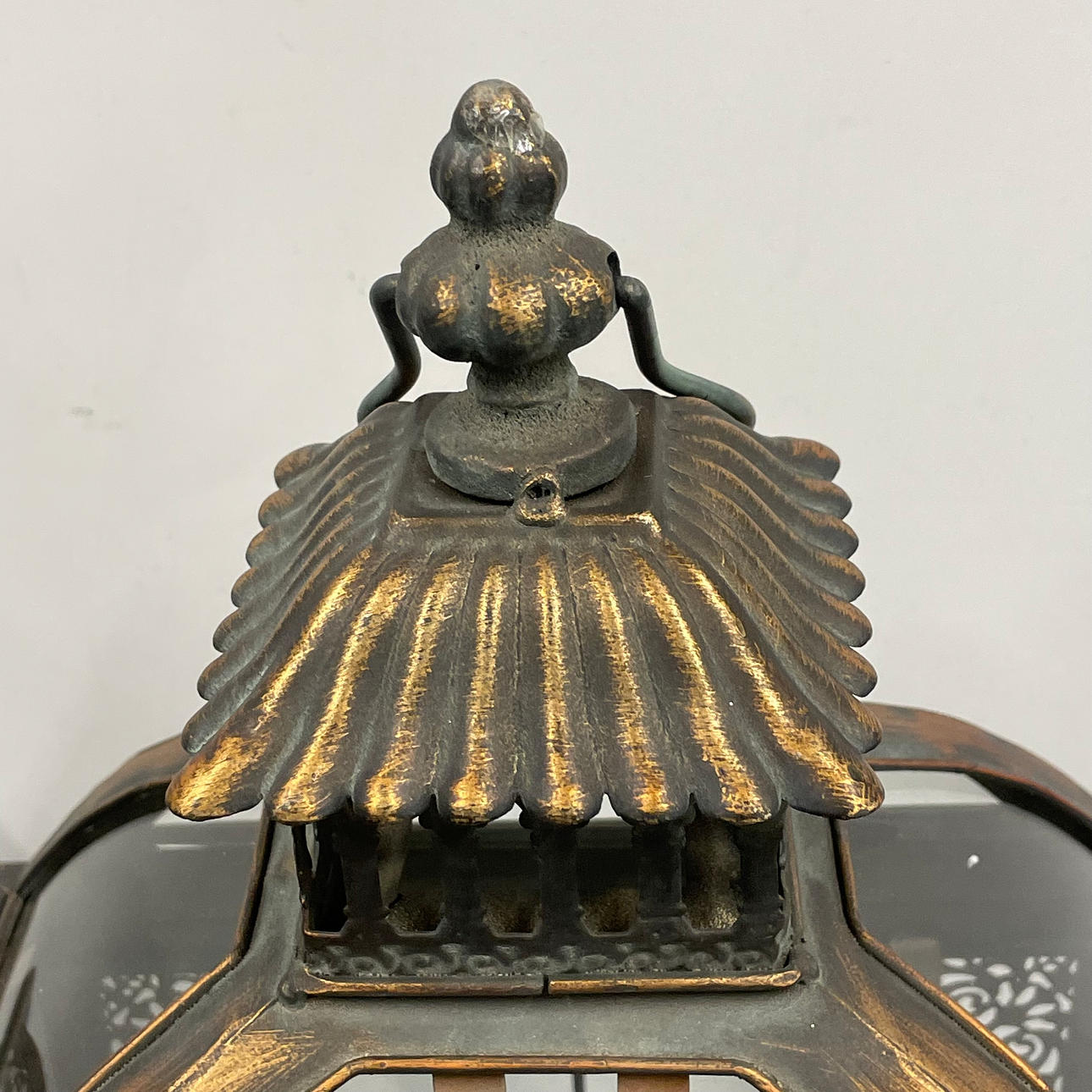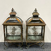 A pair of bronzed metal and glass storm lanterns.