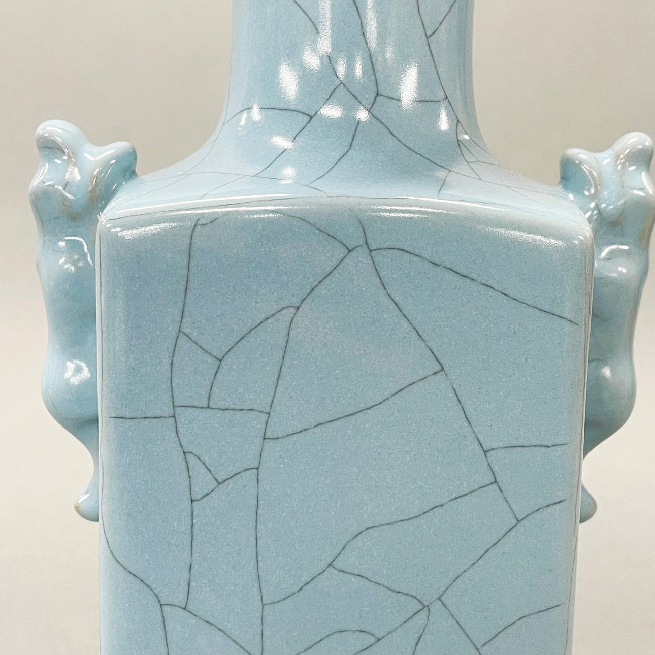 A Chinese pale blue crackle glazed square form porcelain vase, H. 23cm.