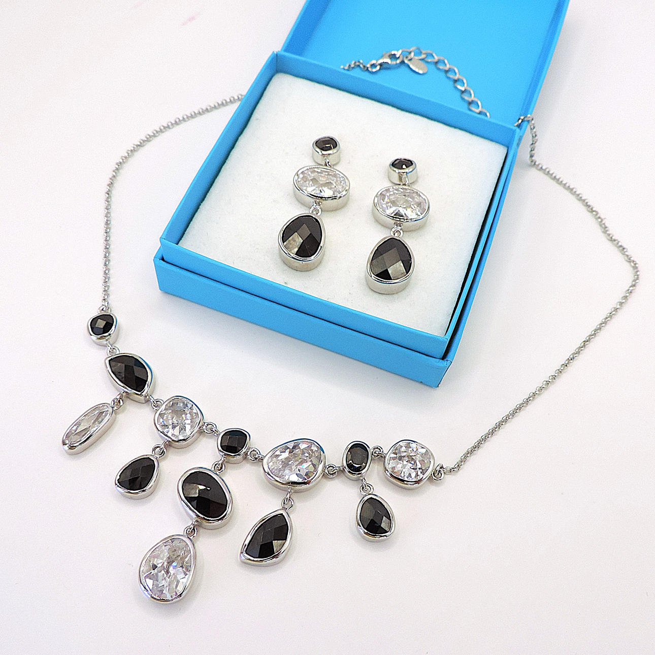 A fabulous necklace in sterling silver set with large sparkling black and white crystals and matching 4cm drop earrings. Necklace is 18 inches long. Stamped 925.