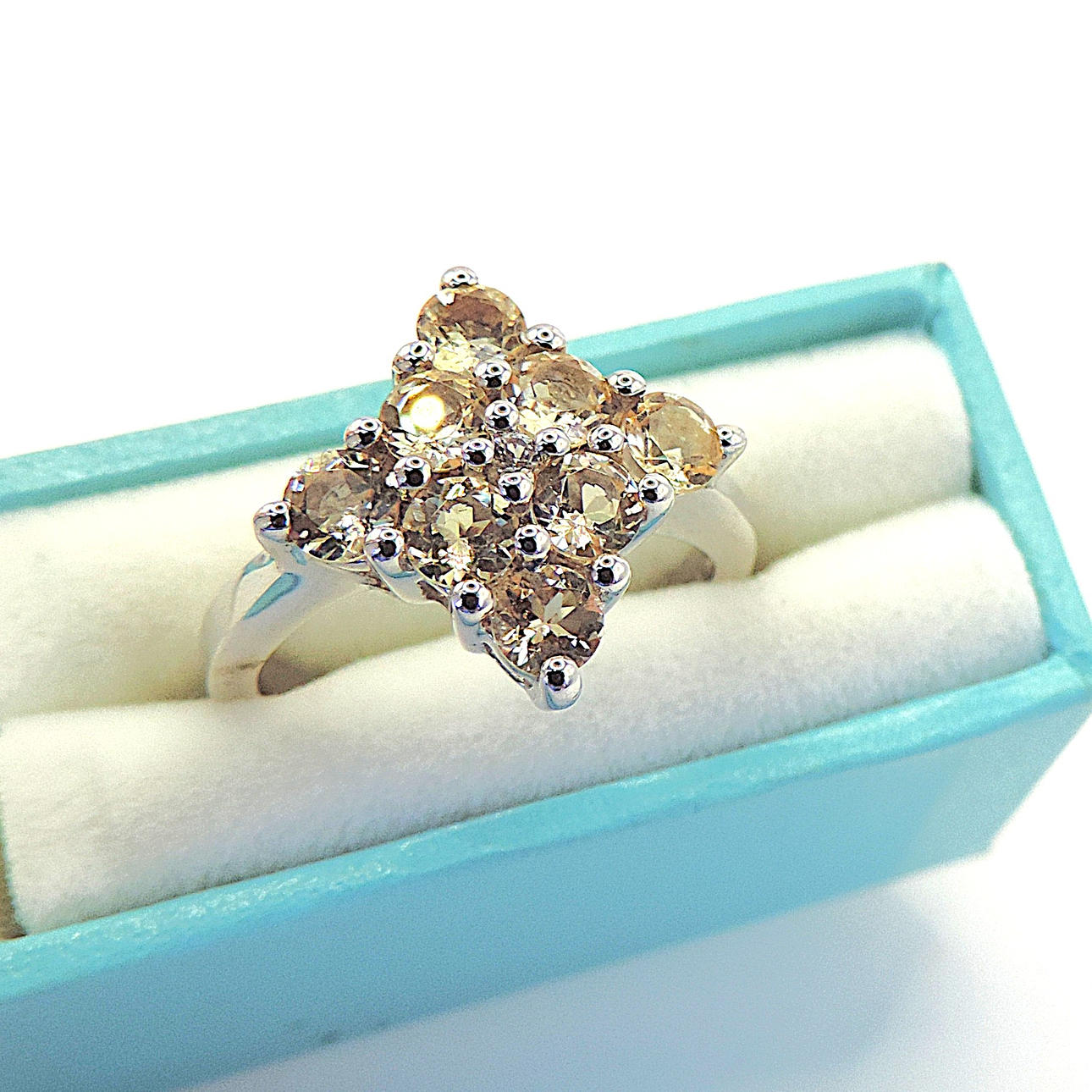 A ring in sterling silver set with 8x3mm lemon Citrine gemstones. Ring size M.