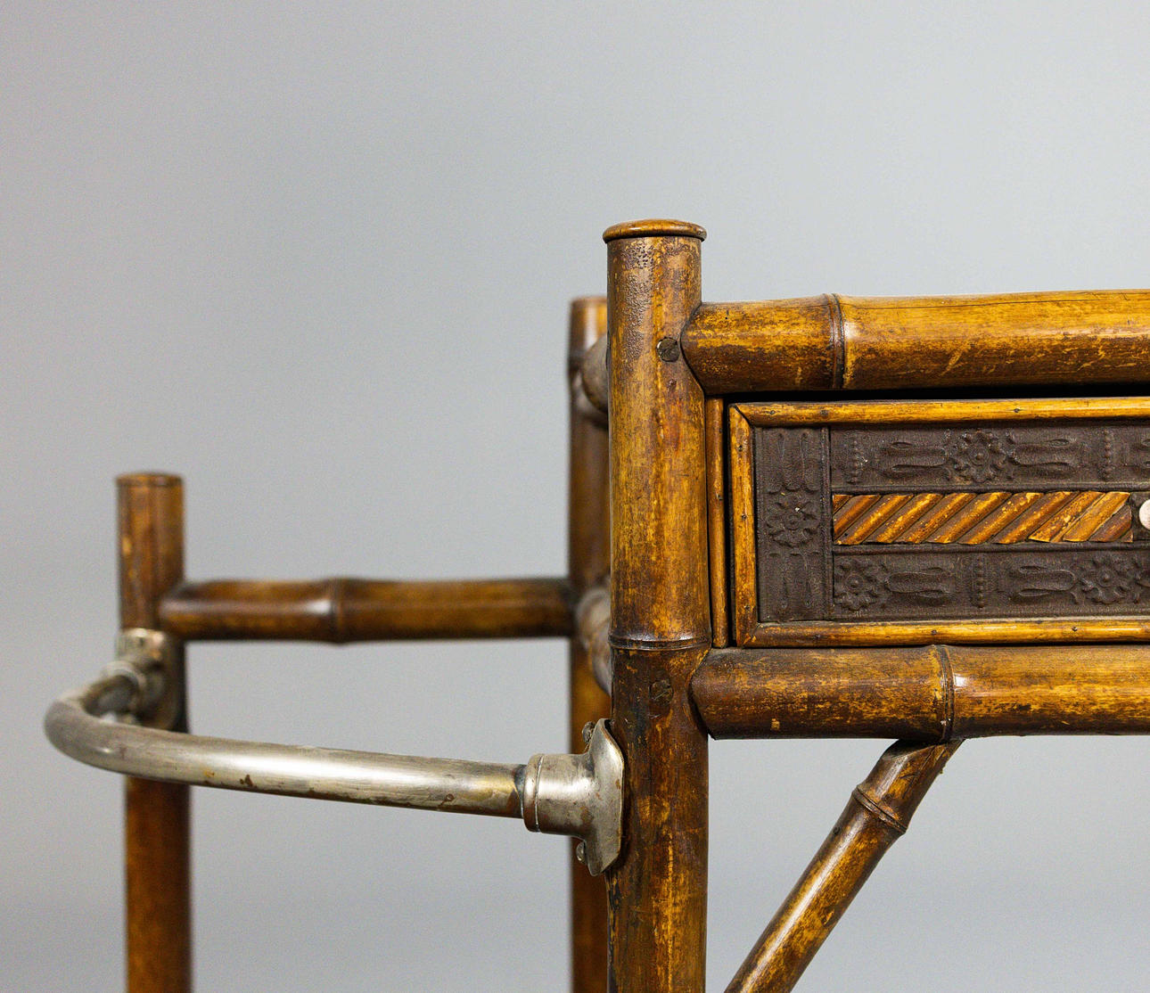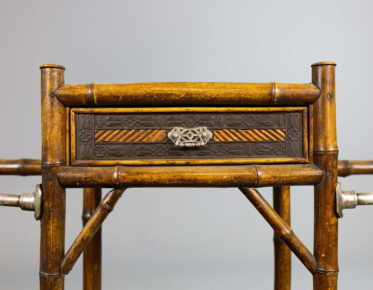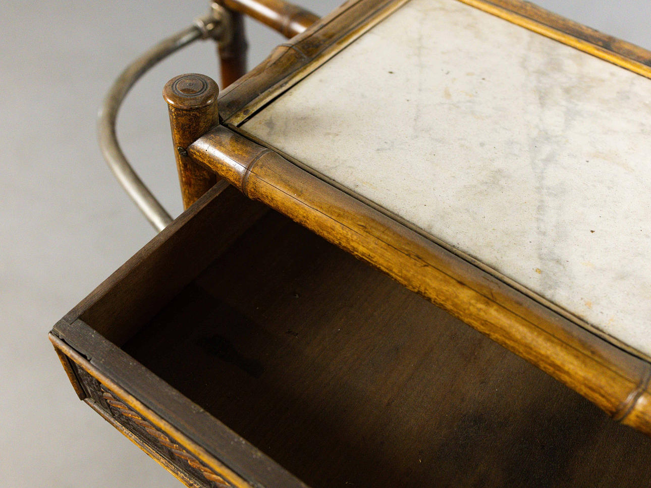 19th century bamboo framed and silvered metal with drawer and marble centre, 92cm W x 97cm H x 33cm D.
