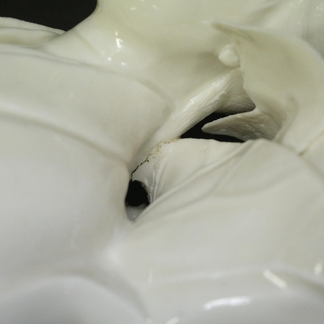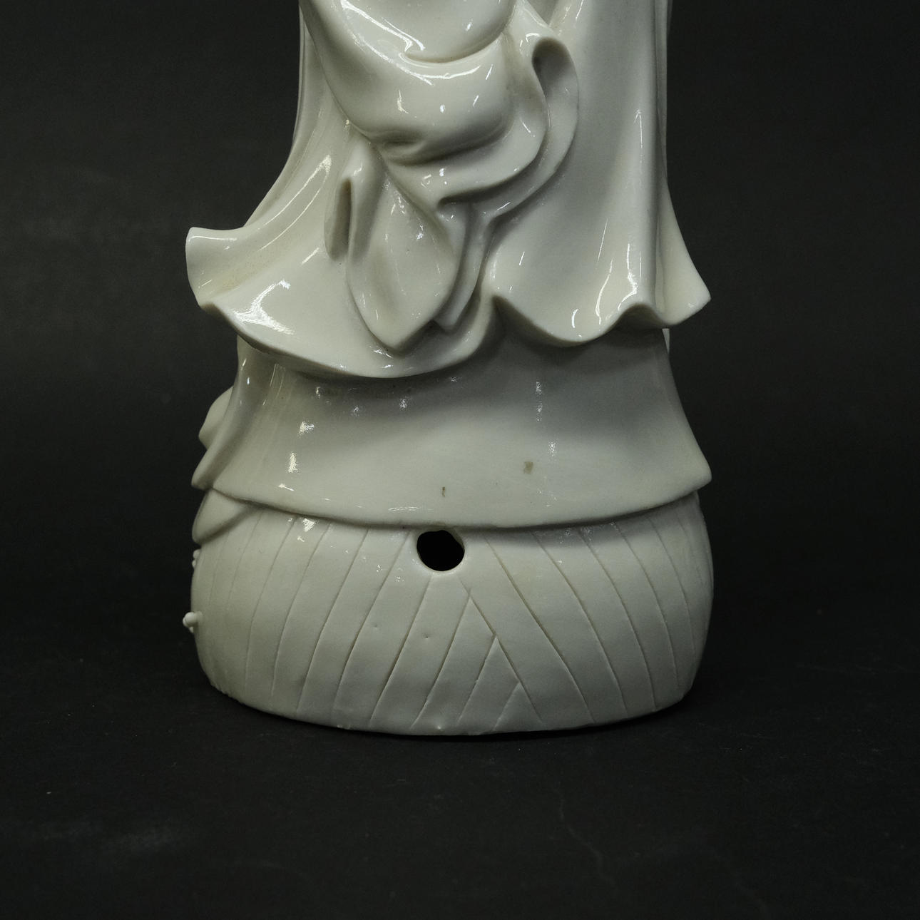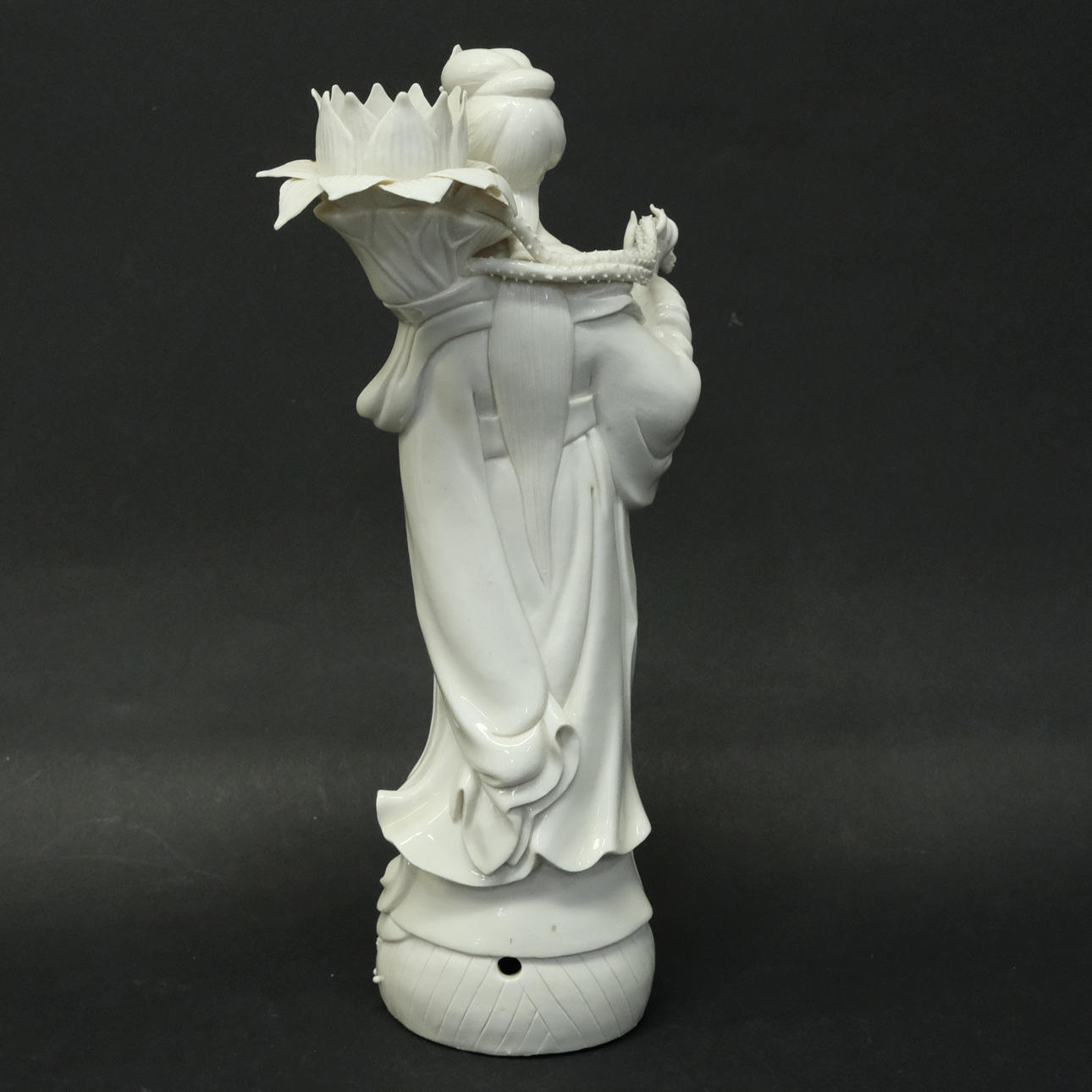 Foot with drilled hole. Flower petals with notches. Repair/manufacturing crack at the neck. Finger with mending.
