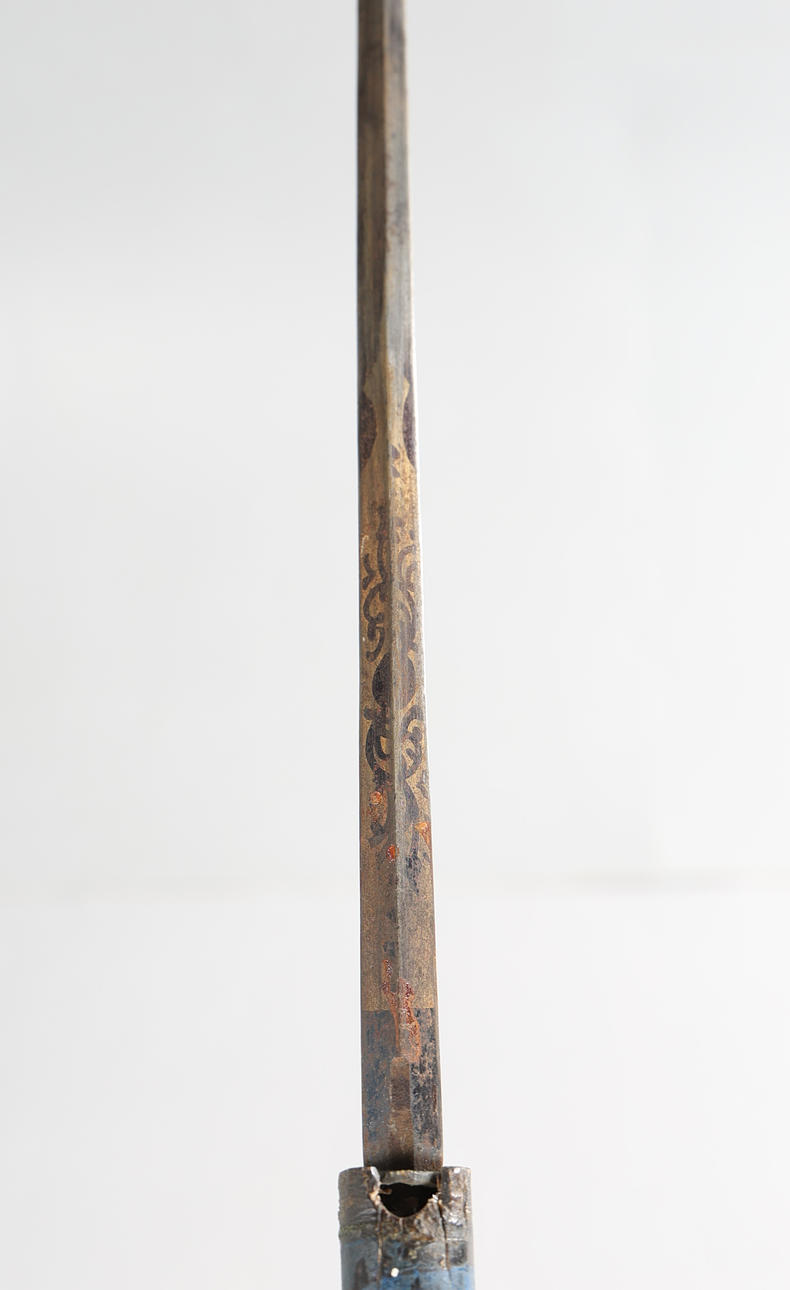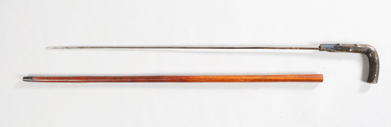 With a horn grip and steel blue blade inside the cane, 89cm long.