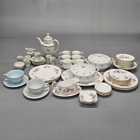 To include 6 cups, 6 saucers, 6 plates, milk jug, bowl, twin handled plate, the largest 25.5cm wide.