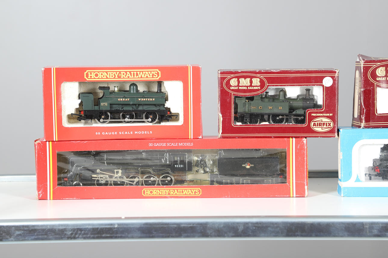 Including GMR GWR tank 1466, Airfix 44454 (x2), GMR 6167 tank, Hornby 2026d Class 14xx, Hornby R760 GWR, and Hornby R330 9F Class. (7).