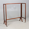 One larger rectangular screen with two fold out smaller screens. Supported with down swept supports. Fold out screen with metal casters and brass hinges. Height 91cm, length 92cm (closed).