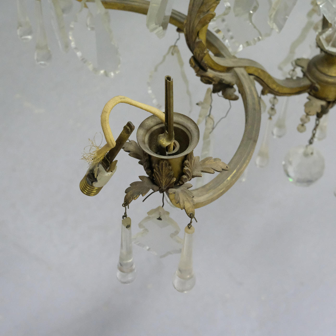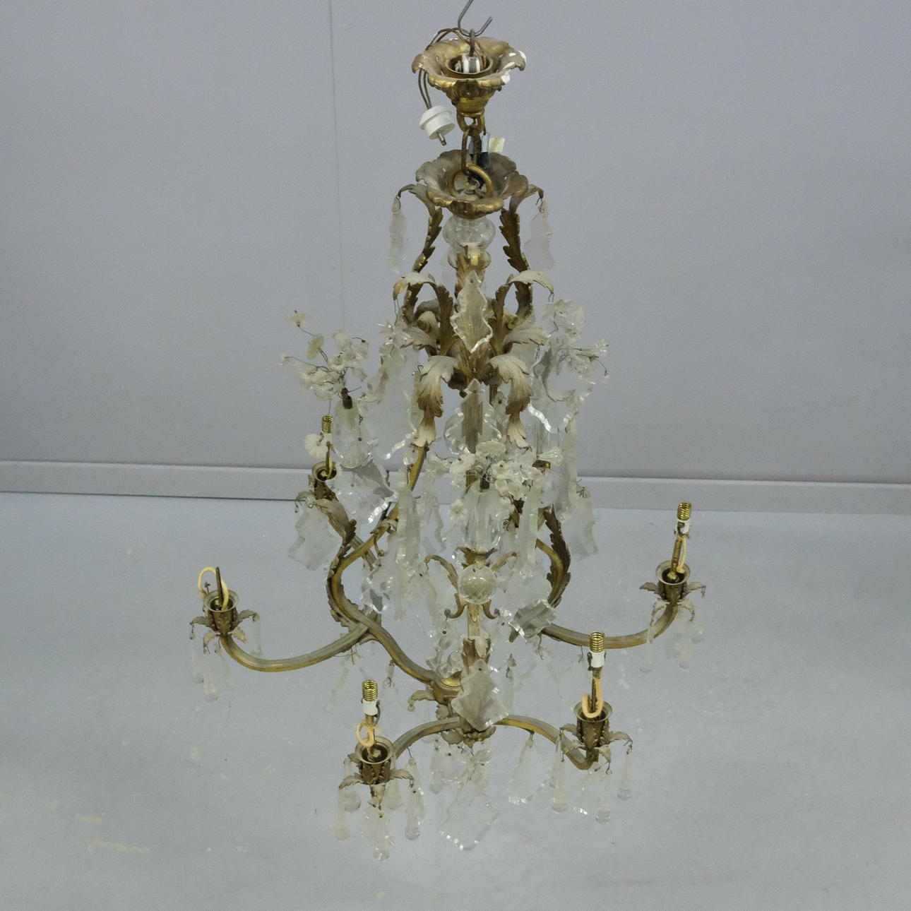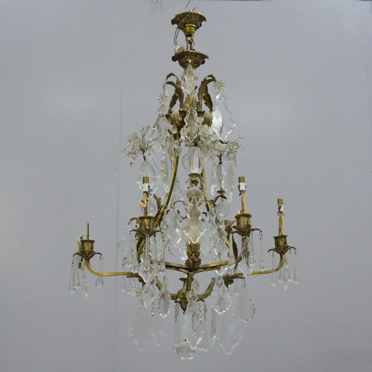 Use and surface wear. Surface dirt. Candle holder and candle holder protection with damage. Some prism with small chips and someone is missing. Frame with patina. Wiring in need of overhaul. Not tested, no functional warranty is provided.