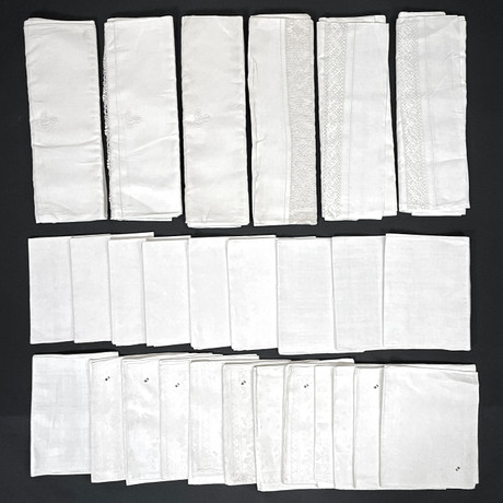 4333313. A tablecloth, linen damask, circa 1900, mirror decorated with winda, wide border repeating the mirror pattern, flanked by narrow bows with fleurons, embroidered monogram (SH).