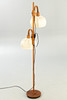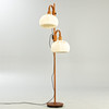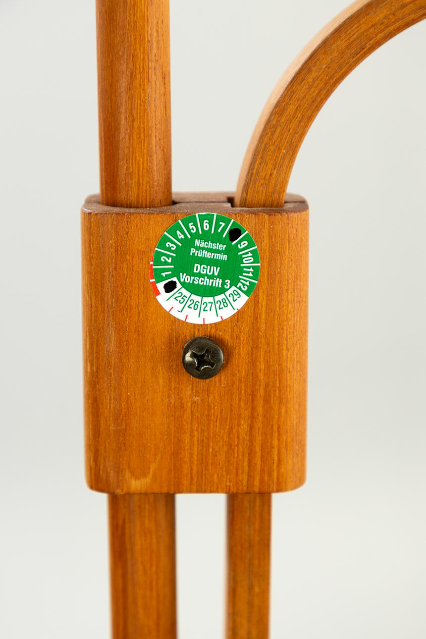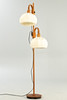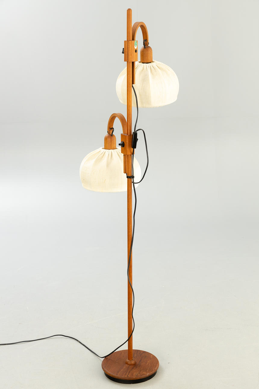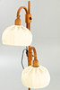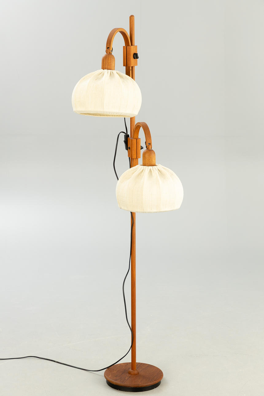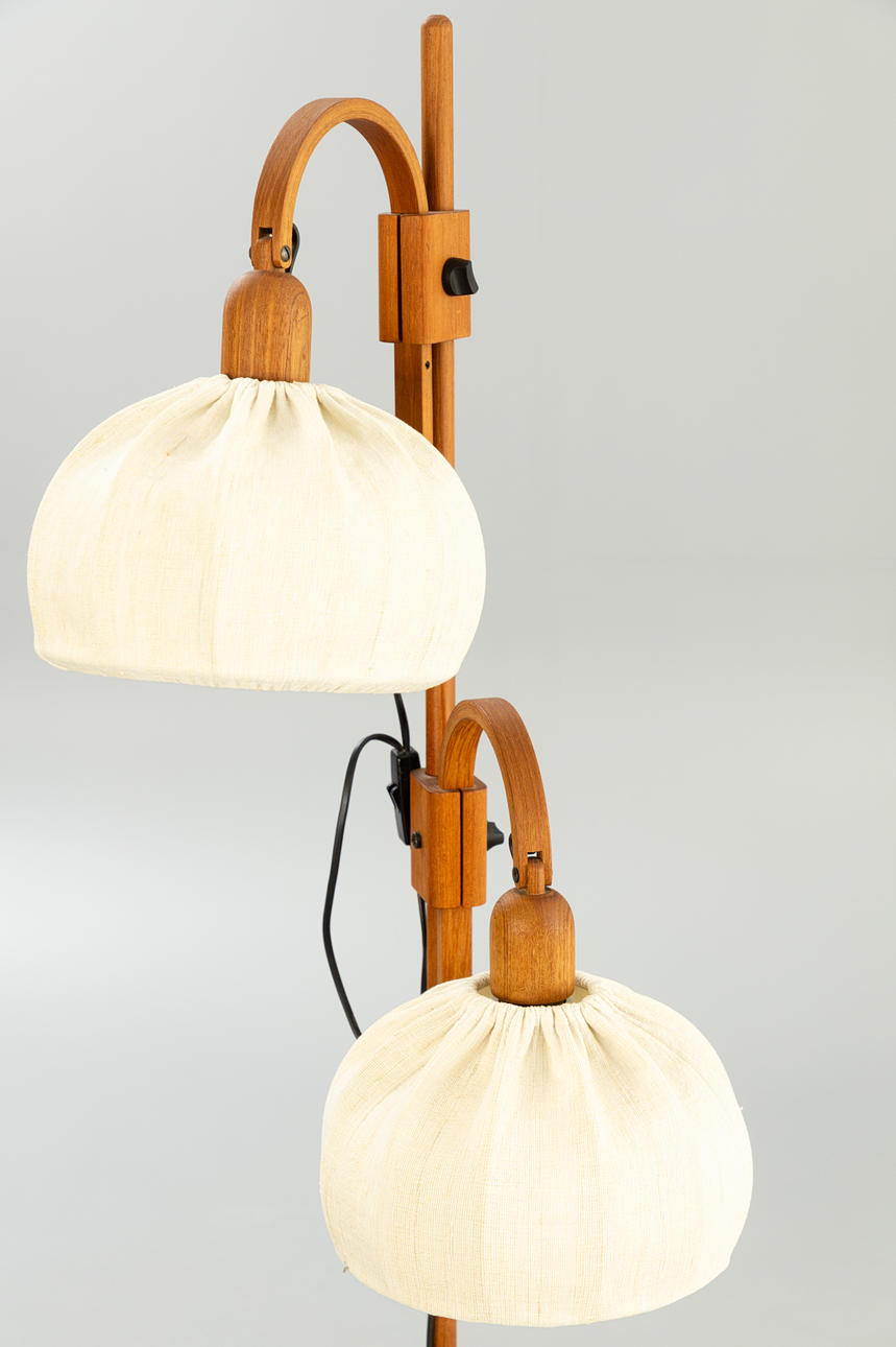 Teak wood with a round stand and two rotating and height-adjustable lampshades with fabric upholstery, one burner each, E27 socket.