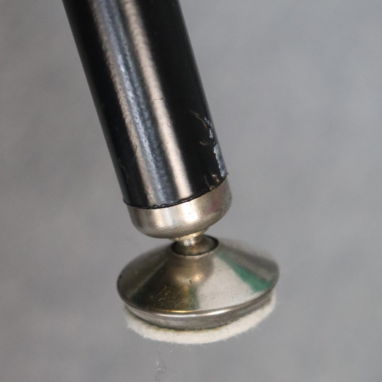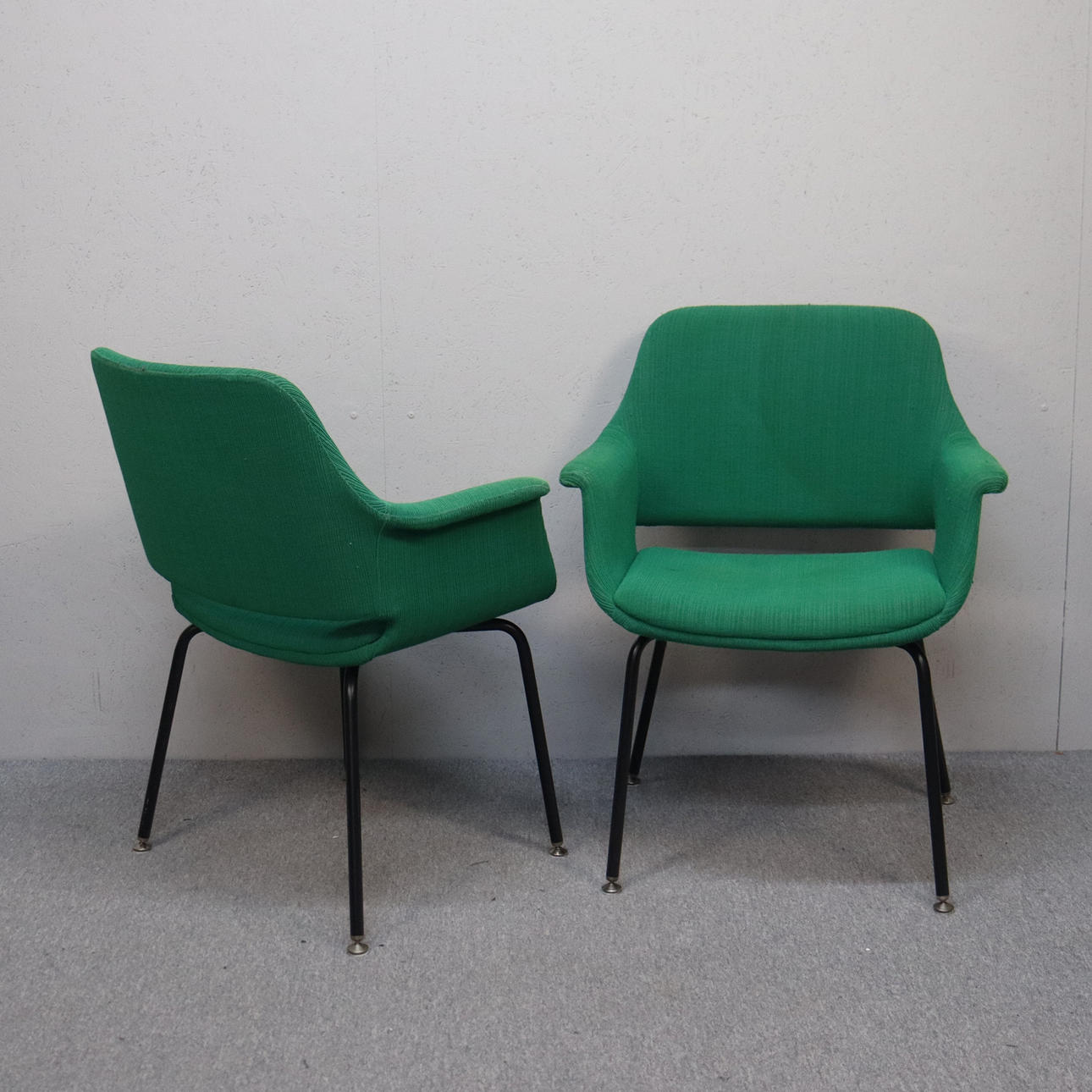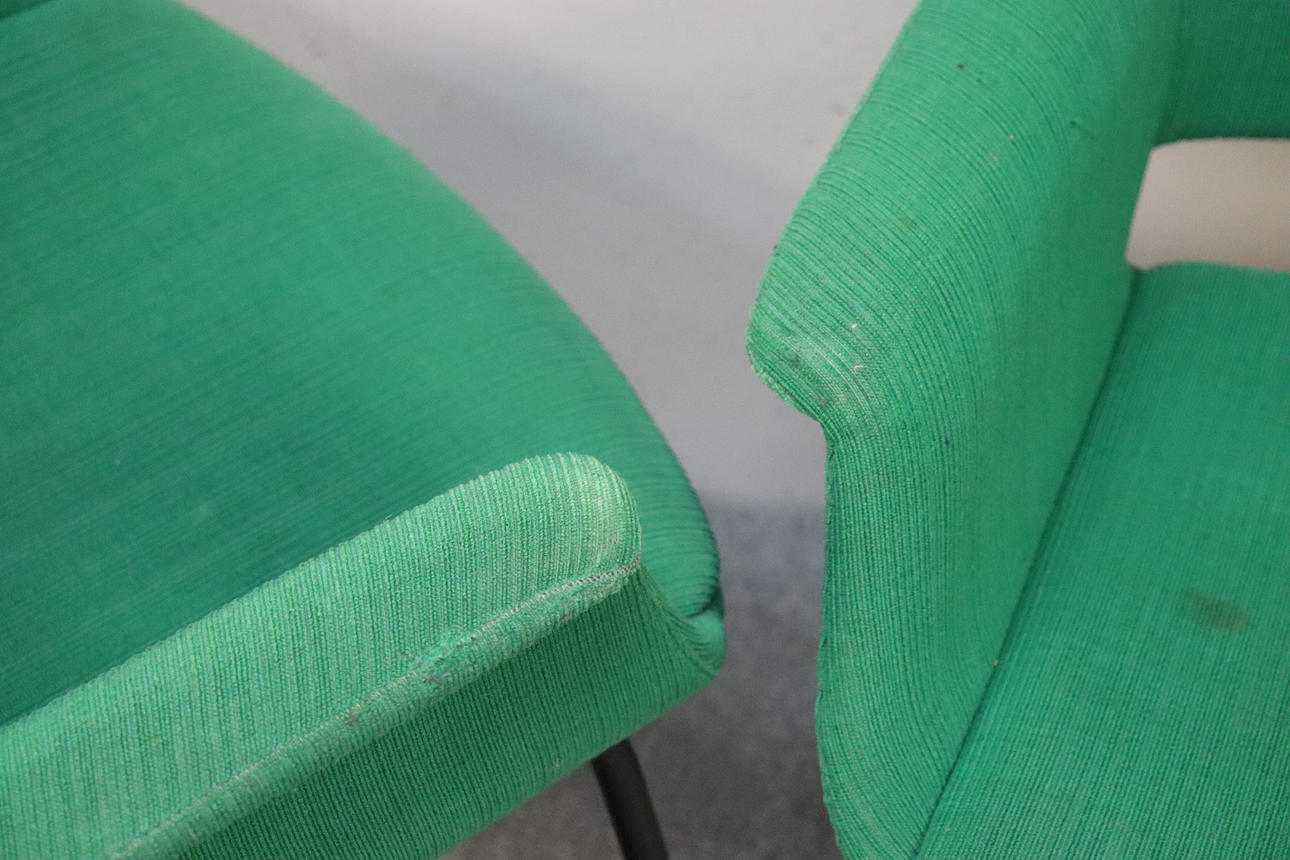 Frame in black lacquered metal, upholstered in green textile, label marked.