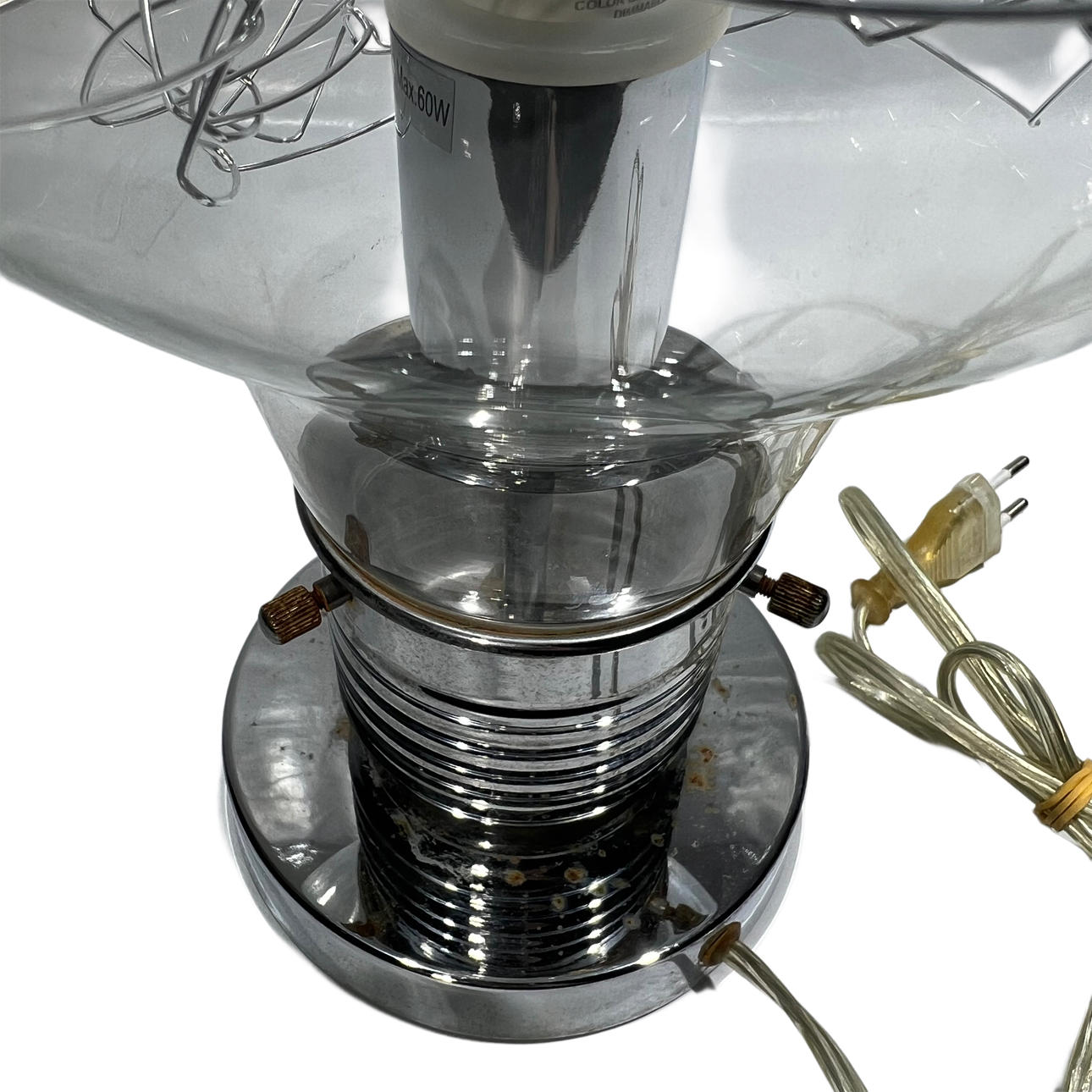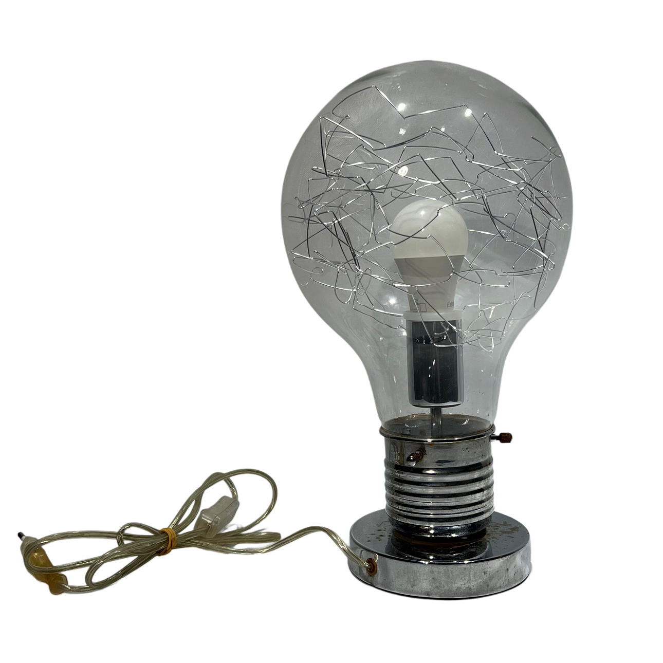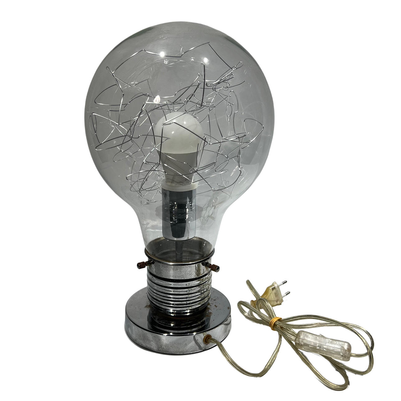 Bulb-like table lamp in chromed metal.