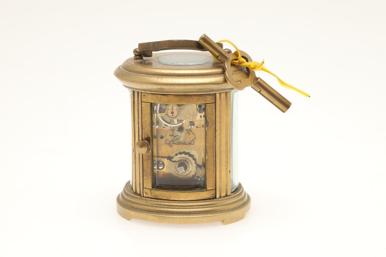 On oval shaped brass cased carriage clock, with an enamel dial with black numerals. With a key, 8.5cms high to the top of the handle.