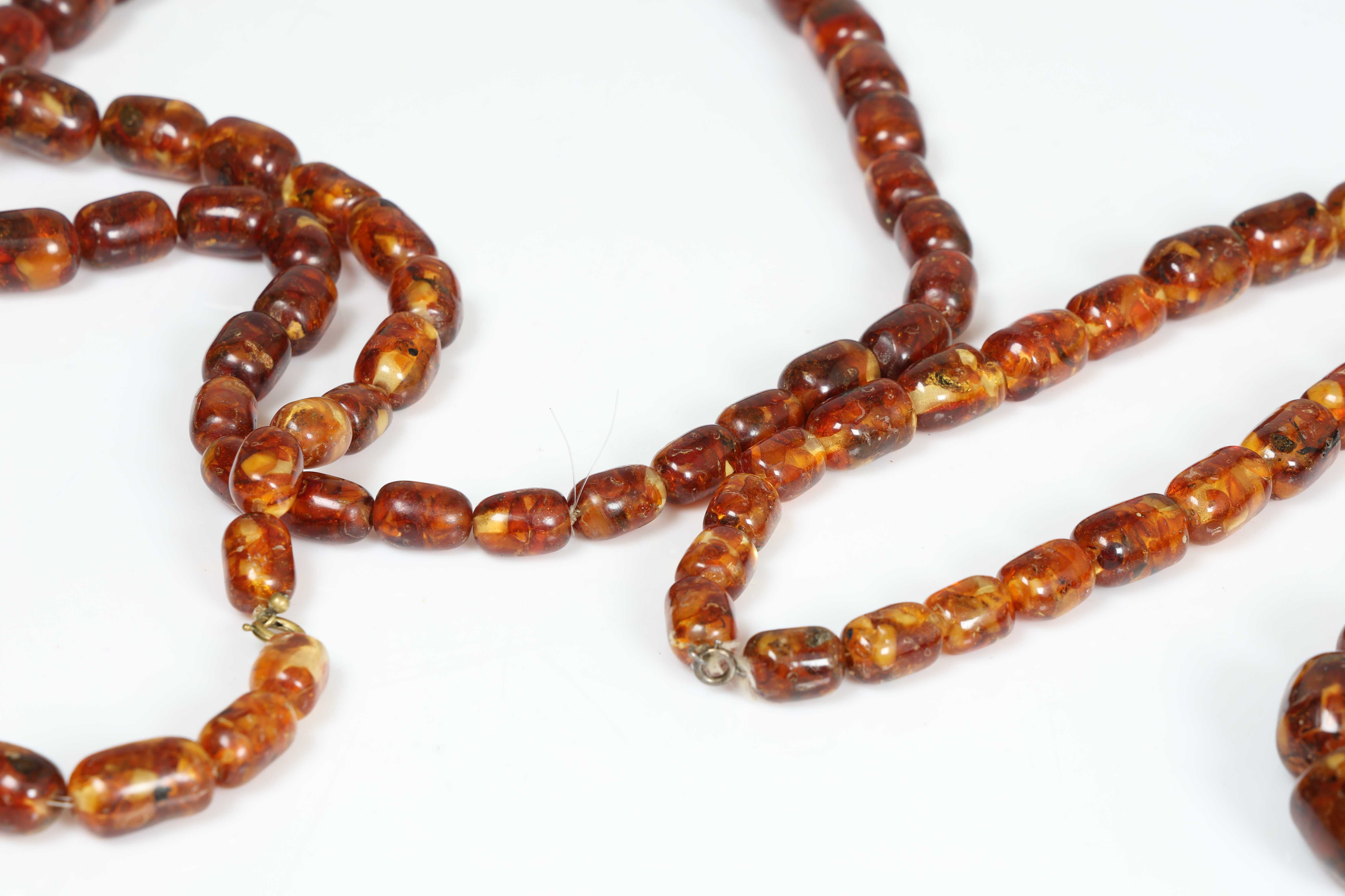 4336232. THREE AMBER COLOURED BEAD NECKLACES (3).