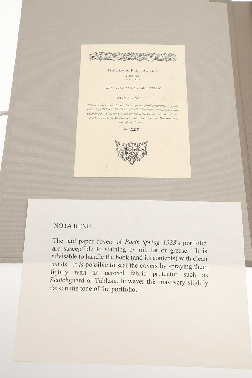Fedor. Rojankowski. Idylle Printanier, or, Paris Spring 1933, number 237 of 500 copies, 31 colour prints including title, original publishers grey card folder, London: The Erotic Print Society, 1993.