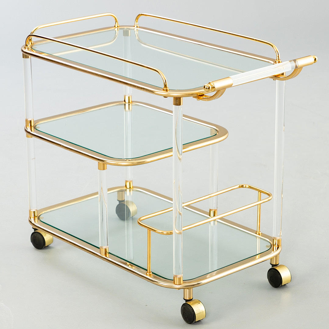 Brass frame, acrylic glass pillars and handle. 3 glass shelves, integrated bottle holder