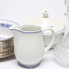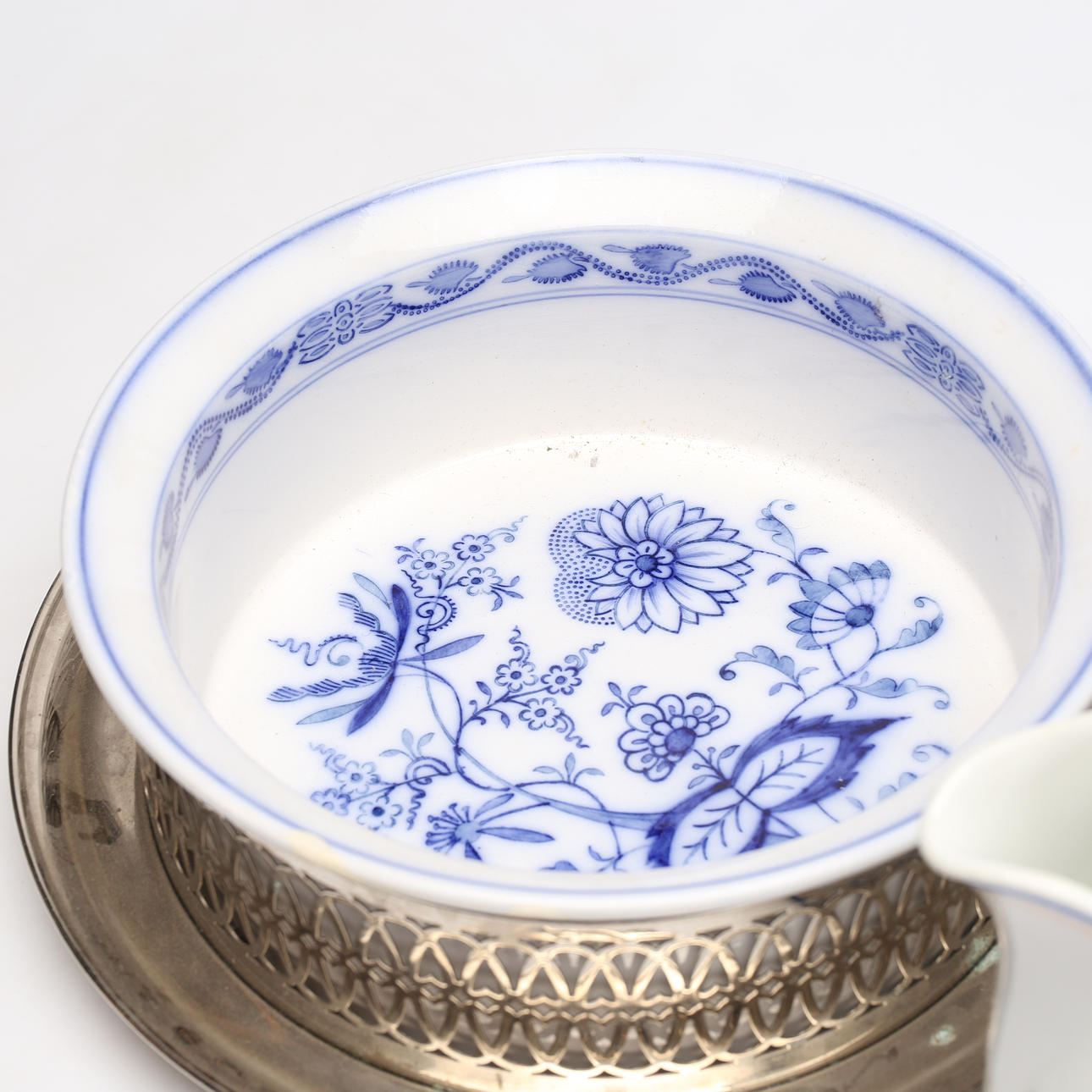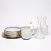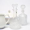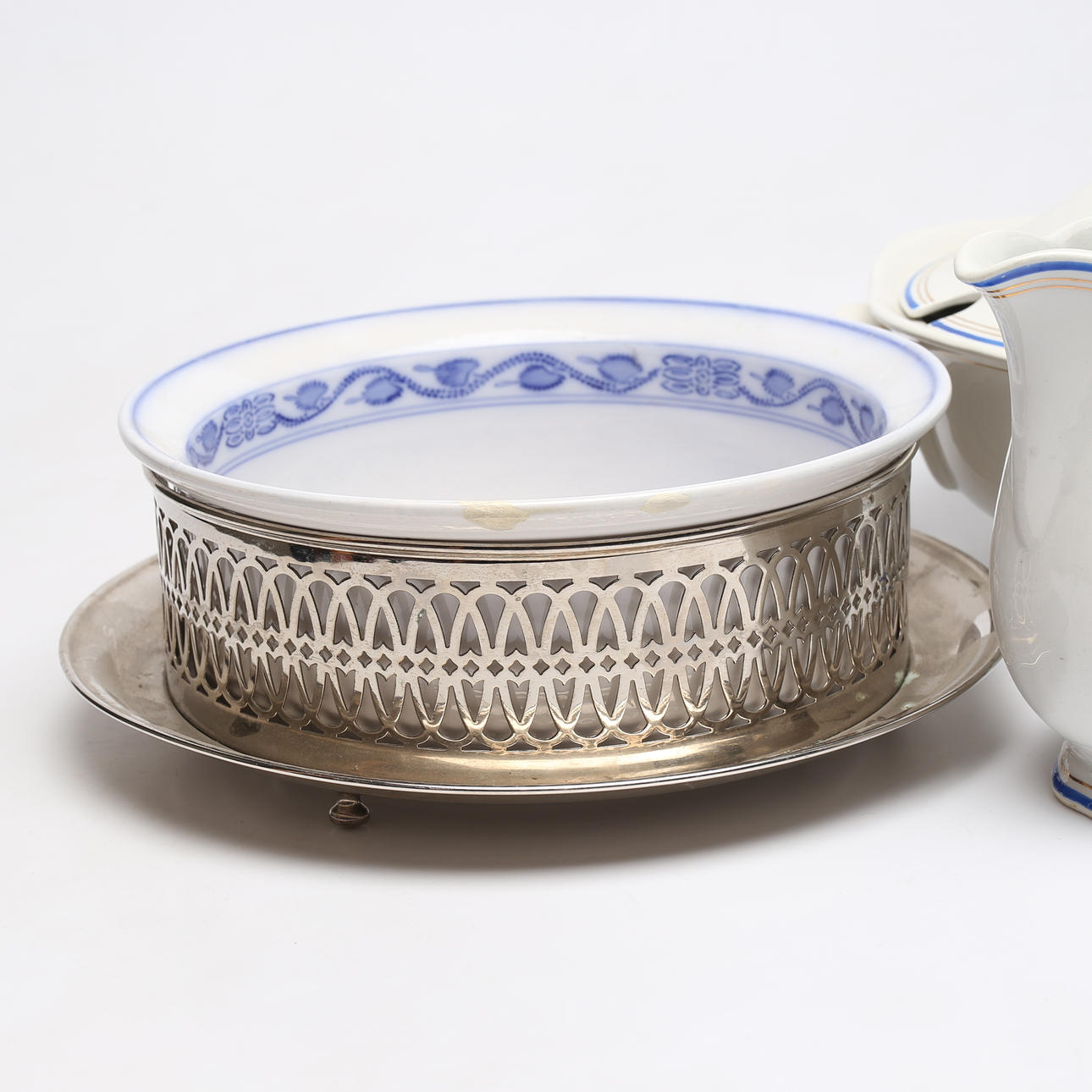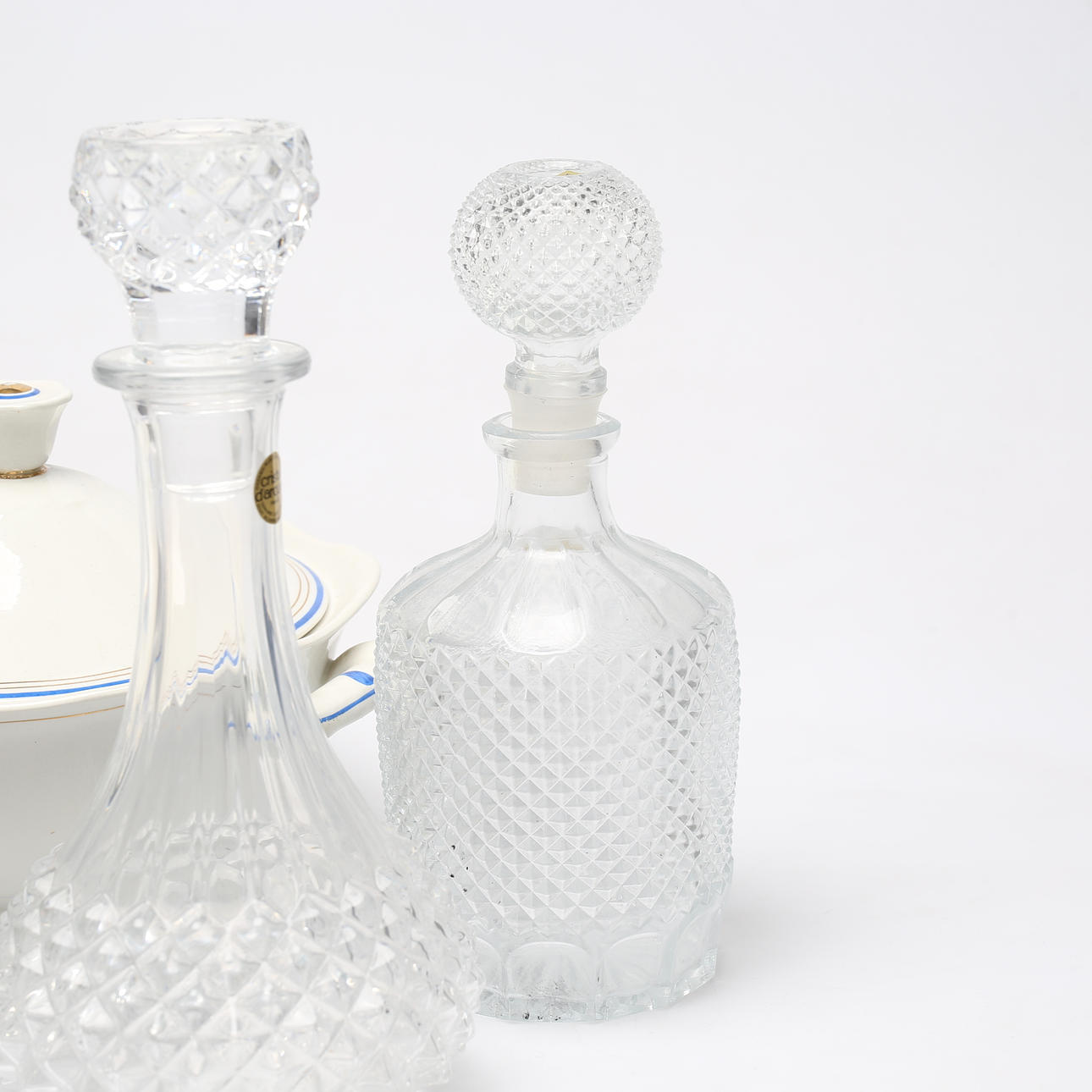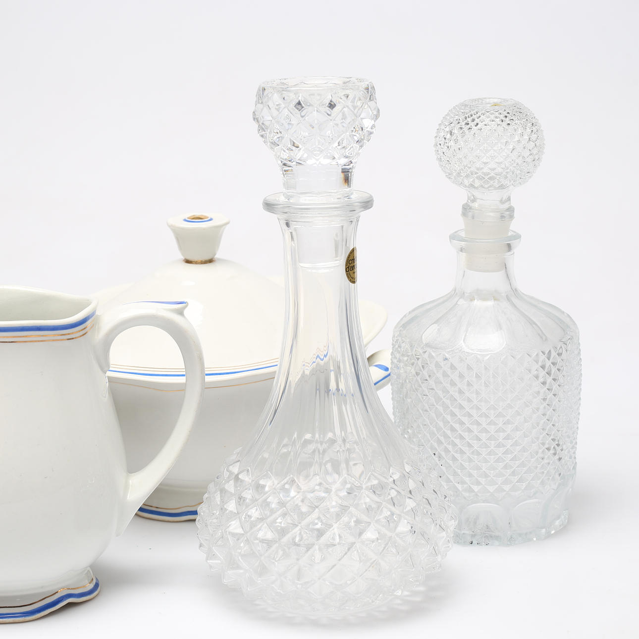 Terrine and jug, Arabia. 2 decanters, glass. Highest height about 27.5 cm. Bowl with white metal and ceramics.