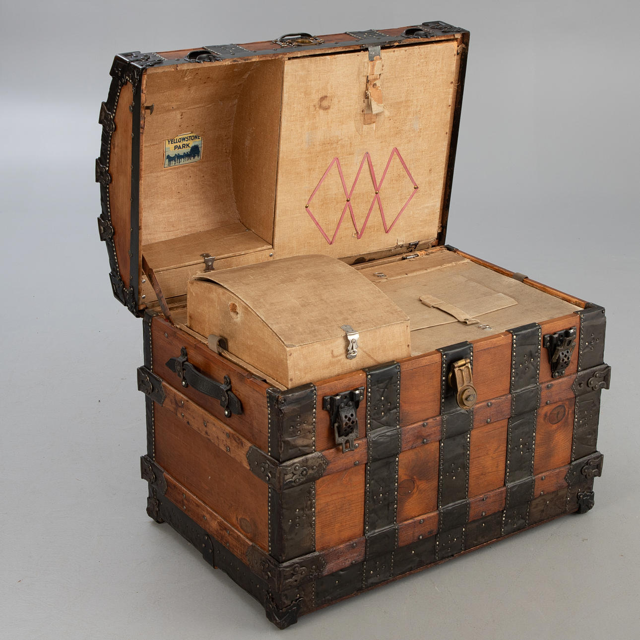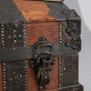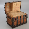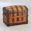 Softwood, light brown glazed/forged iron bands and locks/nettle cover. Rectangular, conically extended body with round lid. Two horizontal struts all the way around. crossed by passive vertical bands. Transitions with reinforced ornamented openwork elements. Arranged interior with canvas cover. HxWxD: approx. 66 x 83 x 54 cm.