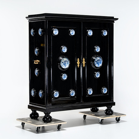 High gaming table with attached chess field. Frame and plate made of beech wood. The dark fields of the chess field made of teak wood. Legs with shoes made of black lacquered beech wood.