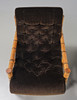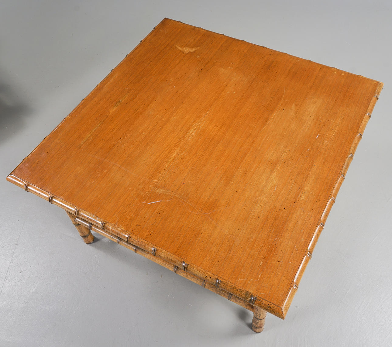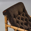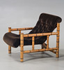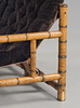 Imitation bamboo frames, sofa, armchair and table. Canvas underfabric, leather straps, cushions with plush upholstery.