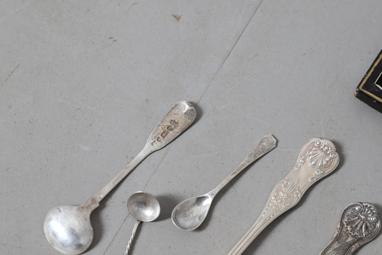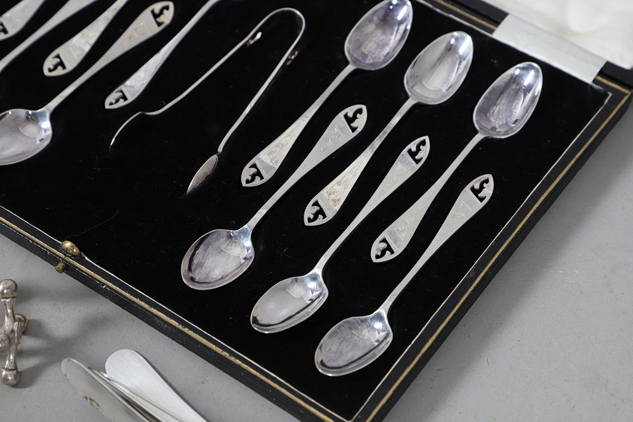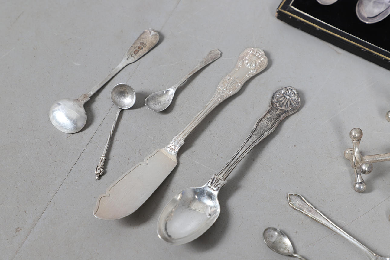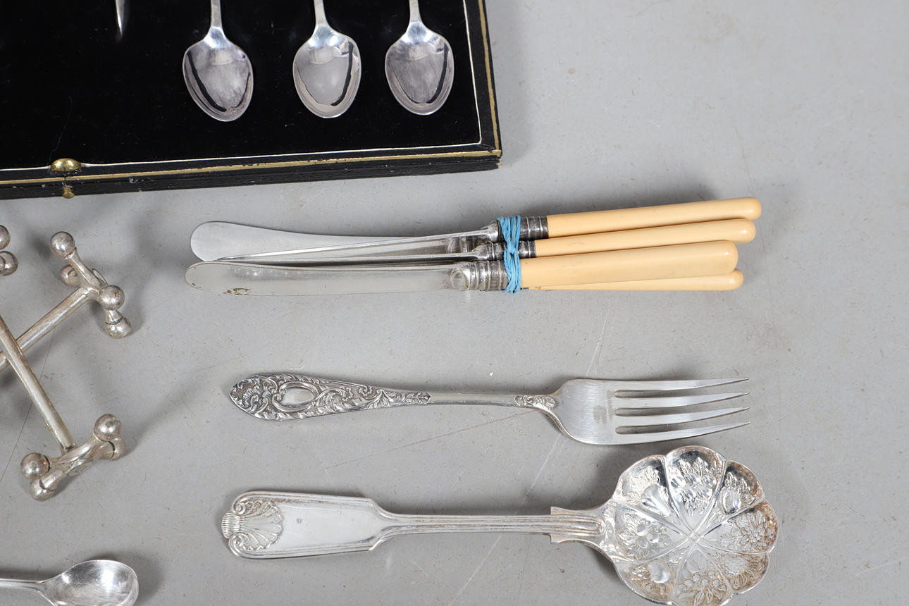 Including a cased set of silver plated teaspoons and sugar tongs (case 27.5cms by 20cms), five pieces of odd silver cutlery including condiment spoons, and plated cutlery.