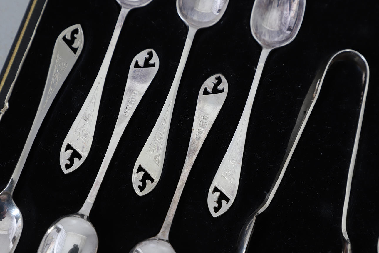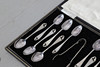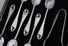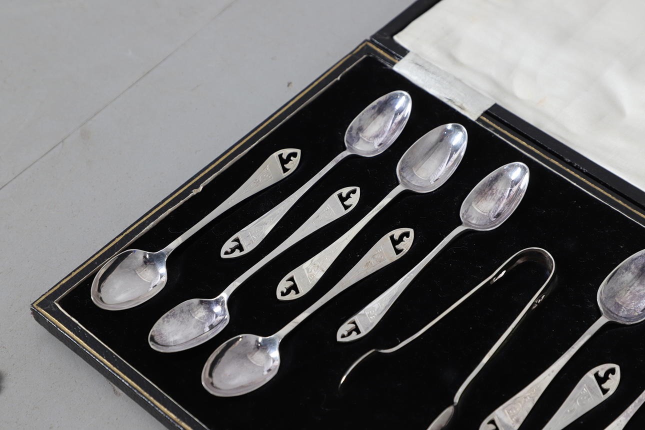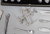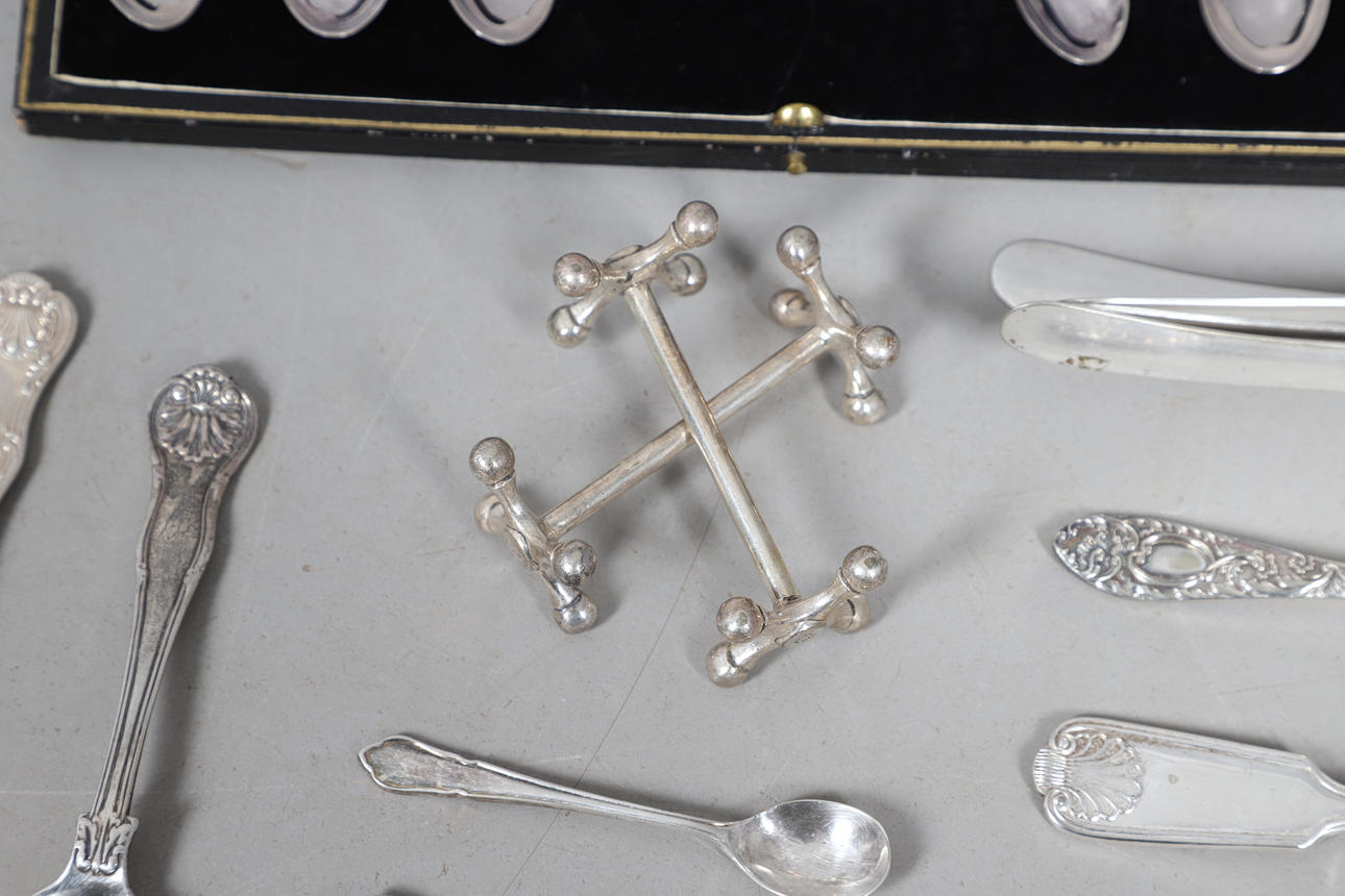 Including a cased set of silver plated teaspoons and sugar tongs (case 27.5cms by 20cms), five pieces of odd silver cutlery including condiment spoons, and plated cutlery.
