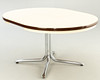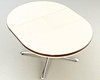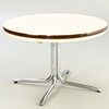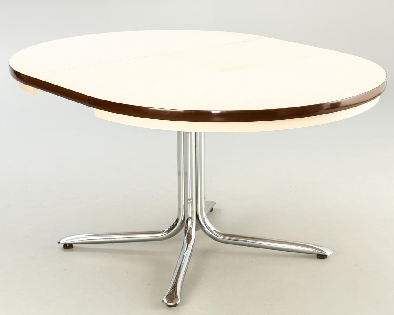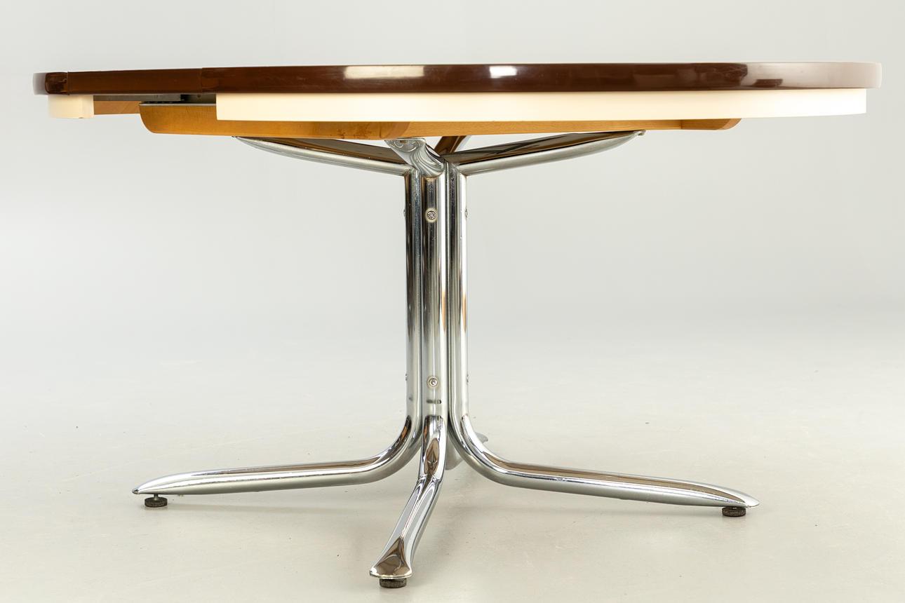 Dining set consisting of a round table that can be pulled out, with a chrome-plated base and a laminated wood table top. 4 chairs with matching frame and rattan wicker seats