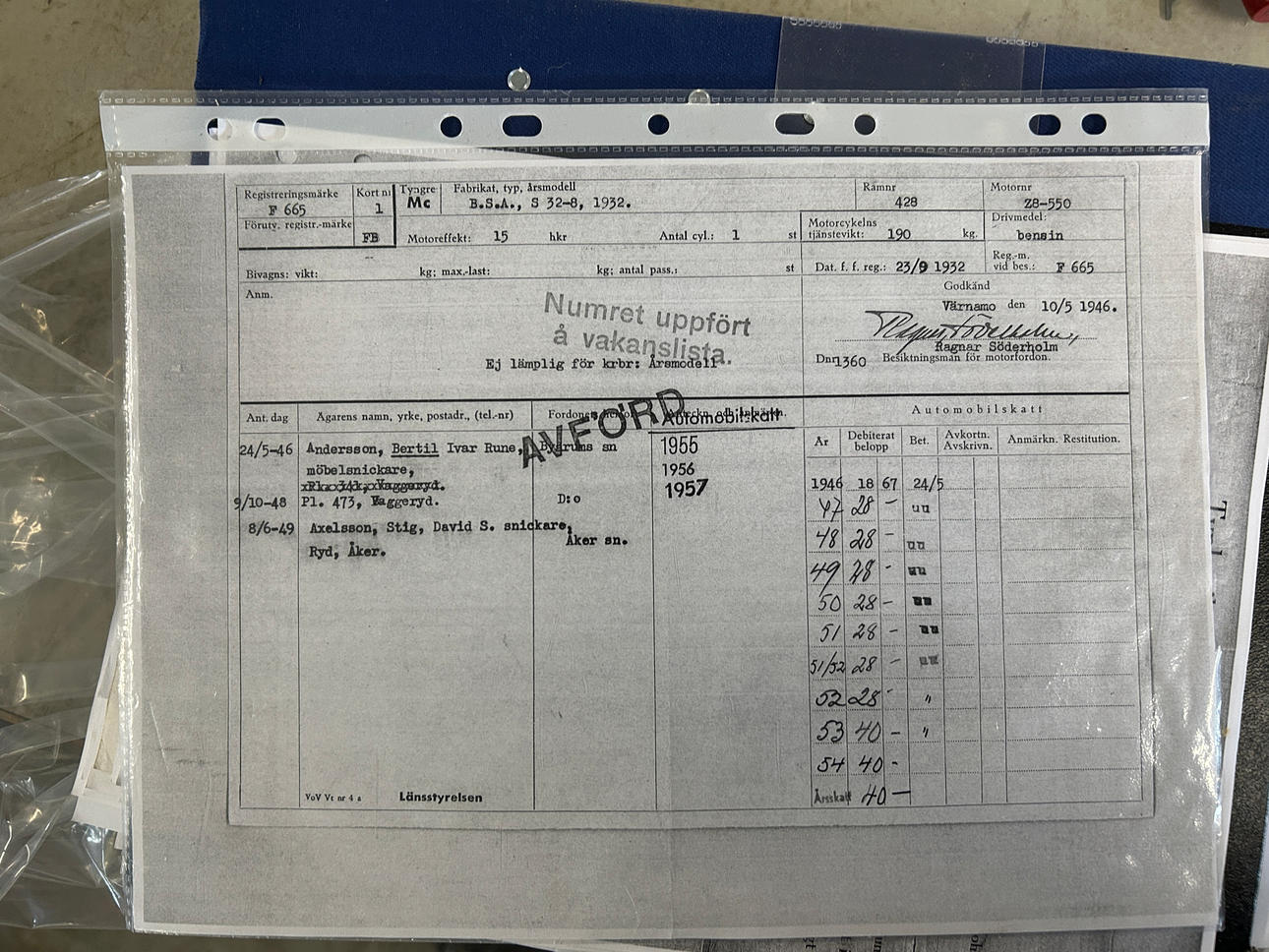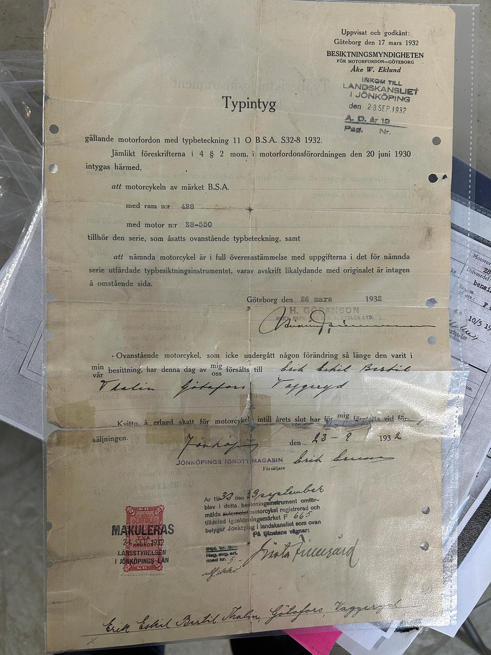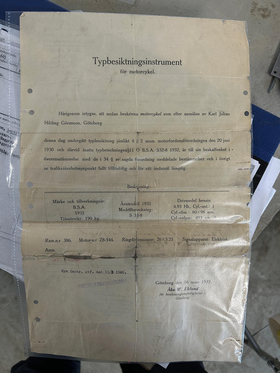 Other: original Type certificate dated 17 March 1932 follows, binder with documentation, receipts and deductions of spare parts lists follows, various loose parts follow such as Bosch signal horn, magnetic generator drive, piston rings, etc.