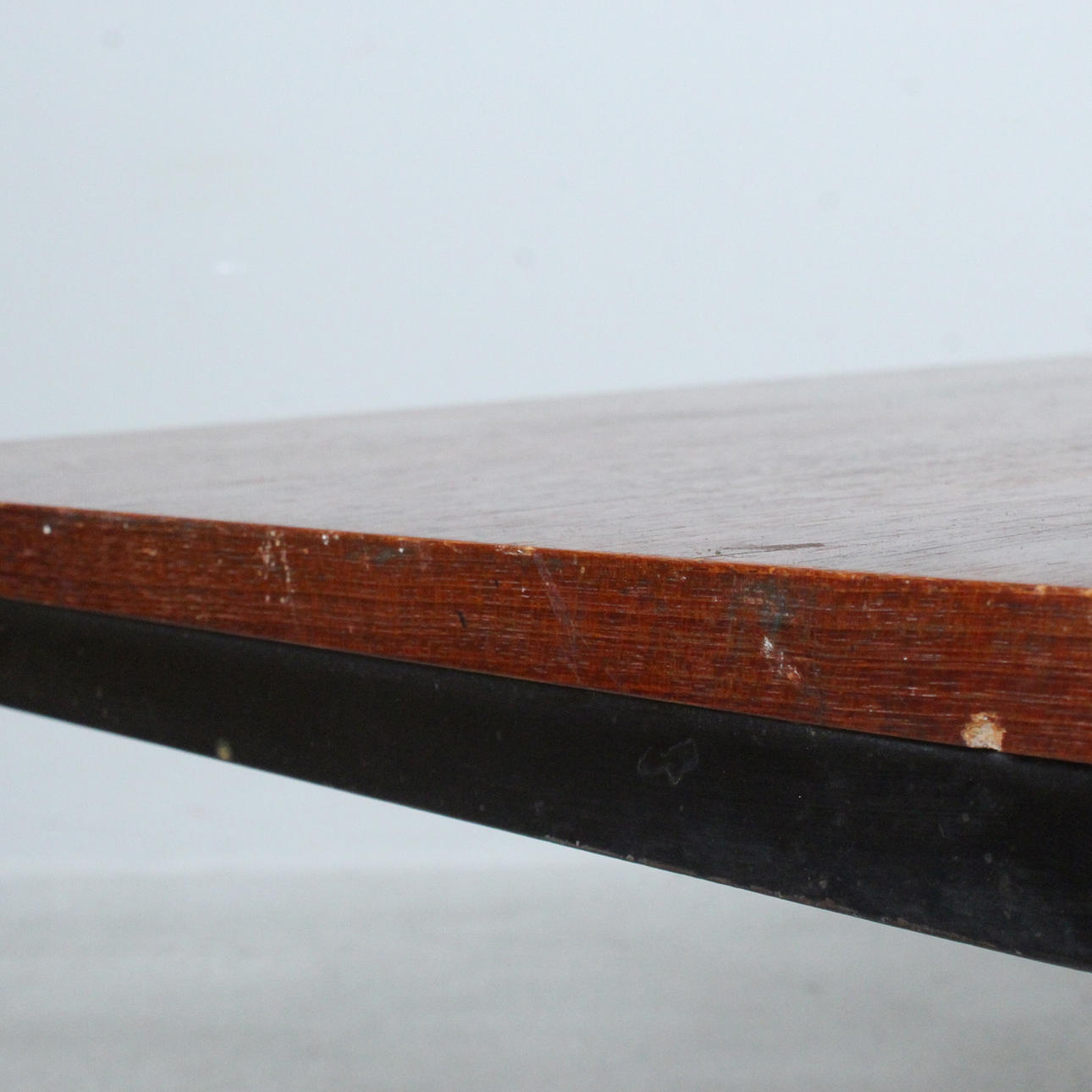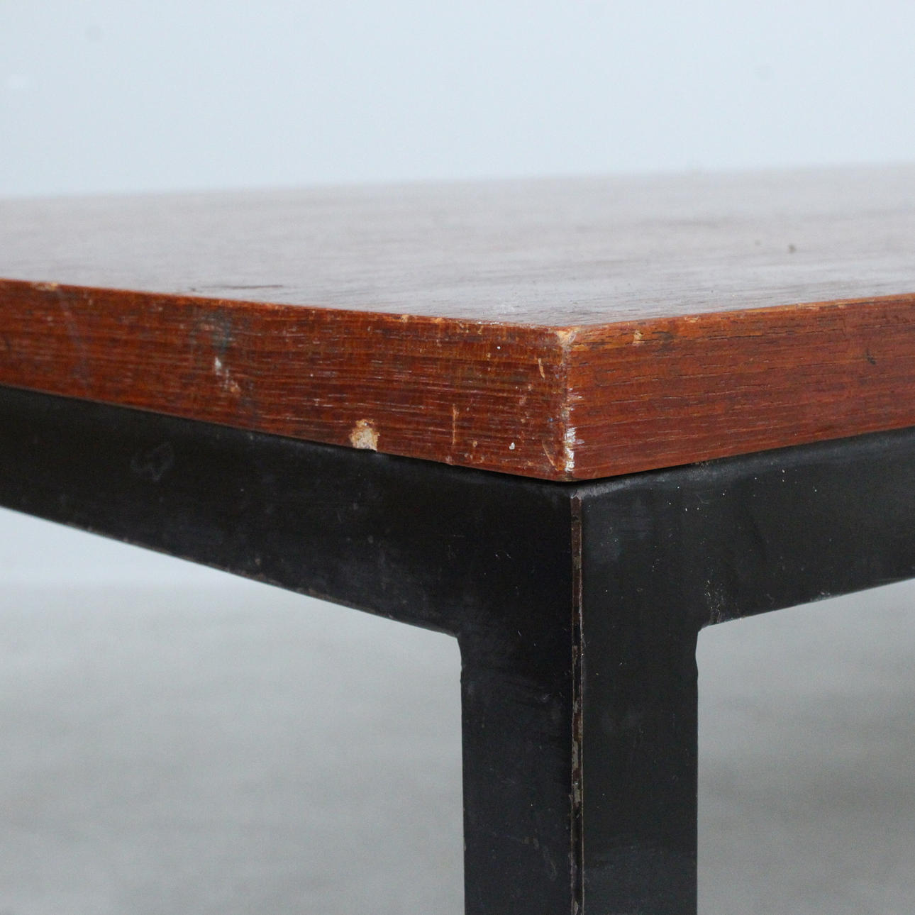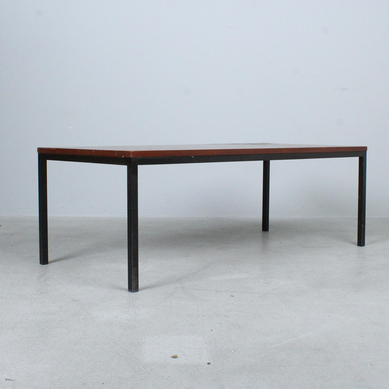 black painted steel frame, teak table top, with manufacturer's label on the underside,
