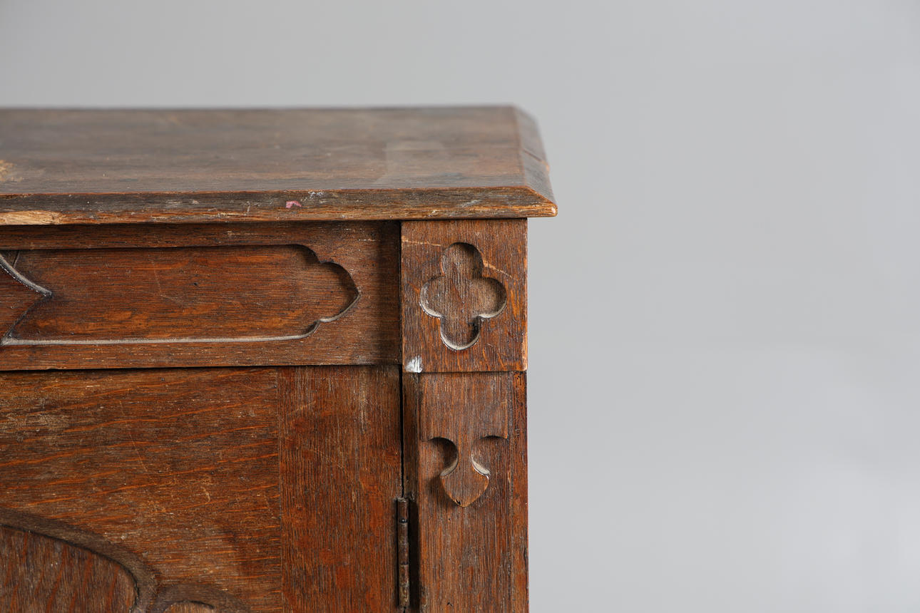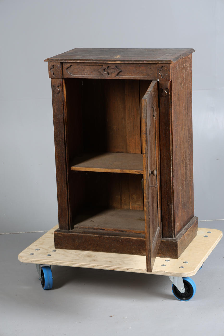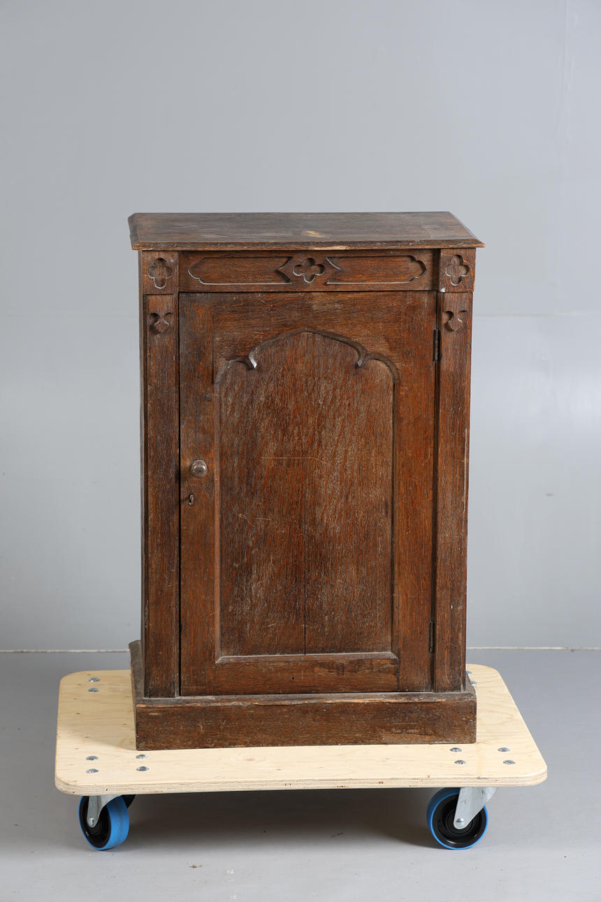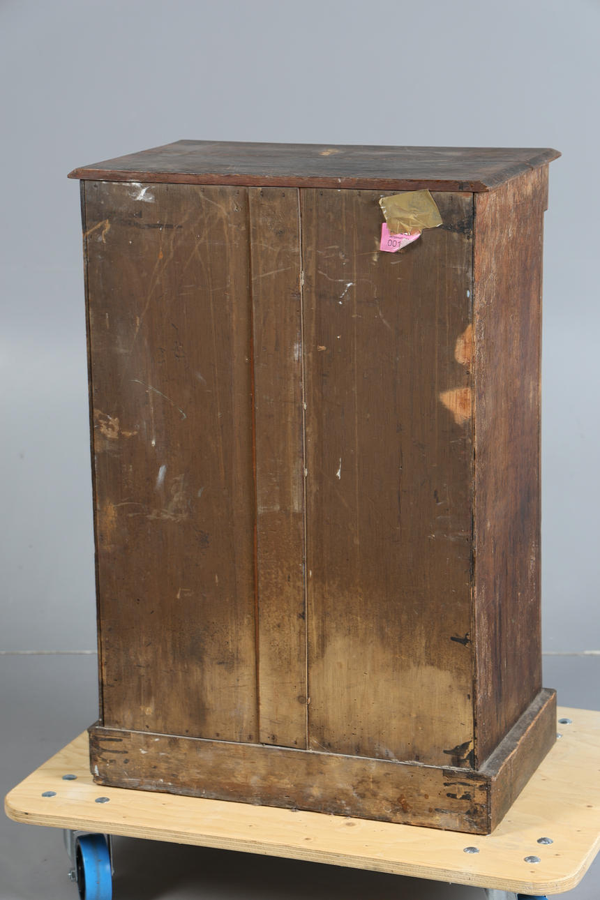 The rectangular top above a carved frieze and a single door, raised on a plinth base, 85cm high 57cm wide 35cm deep.