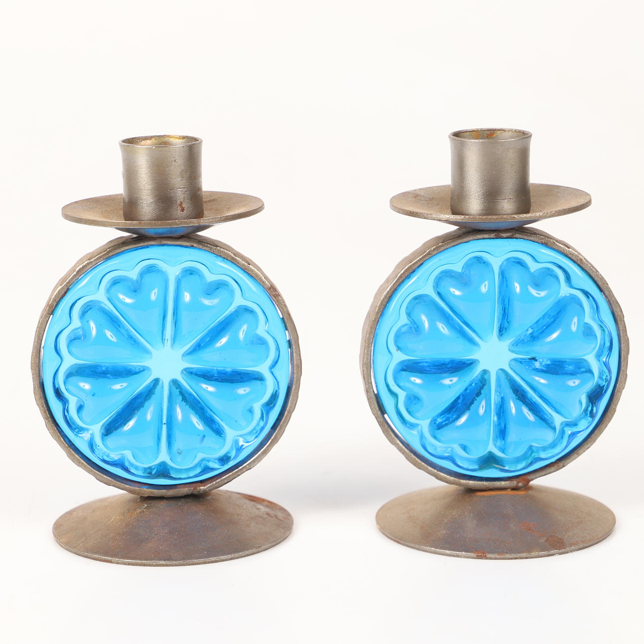 CANDLESTICKS, 1 pair, wrought with blue glass prisms.