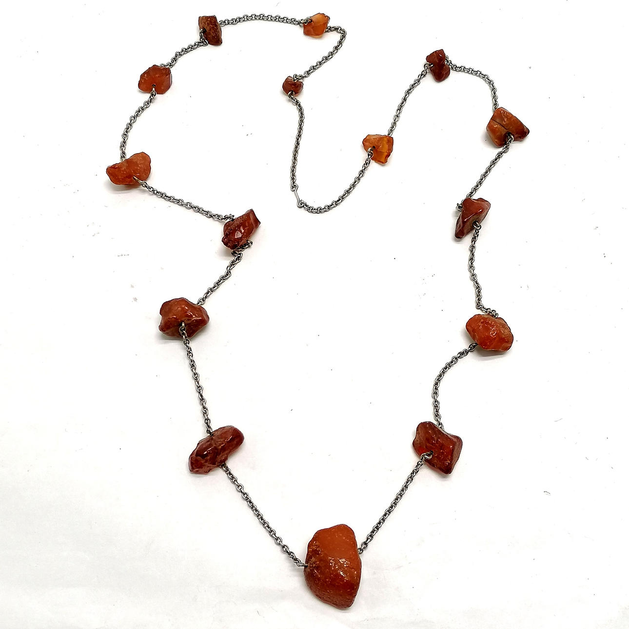 Raw amber bead necklace on unmarked silver chain - 84cm & 31g total weight.