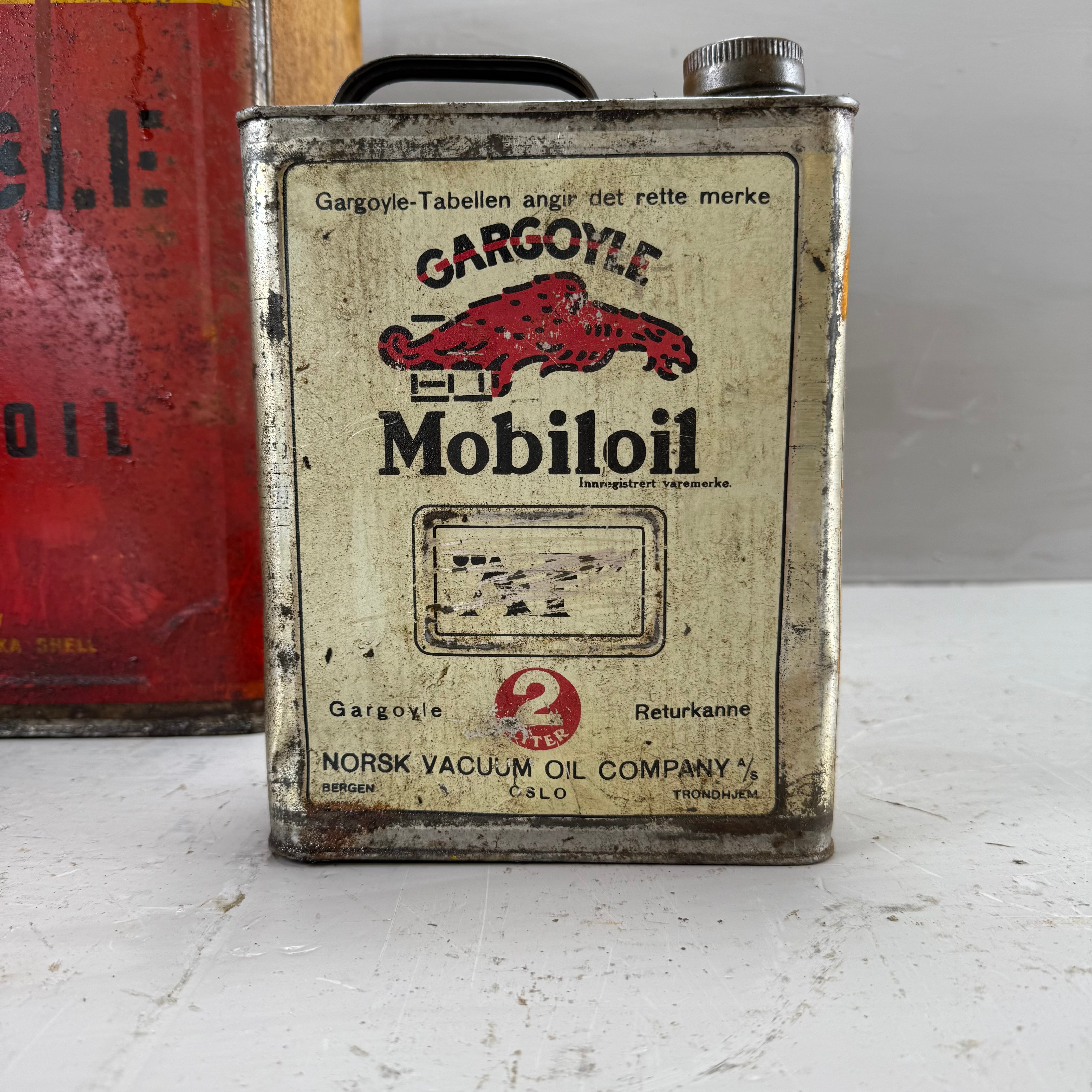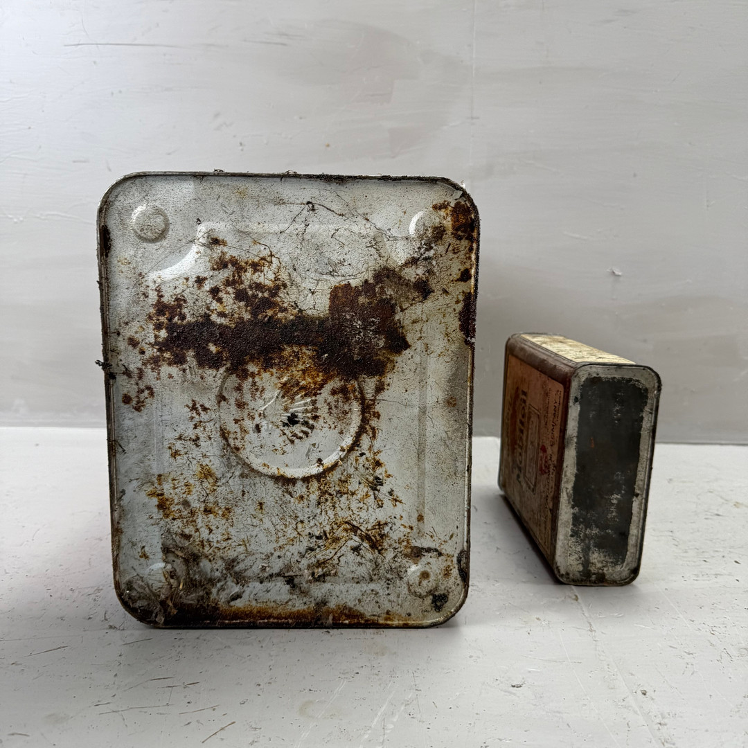 4342628. A shell and a gargoyle, two 20th century tin cans.