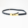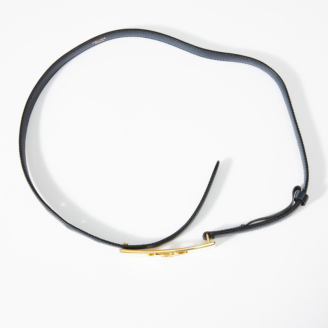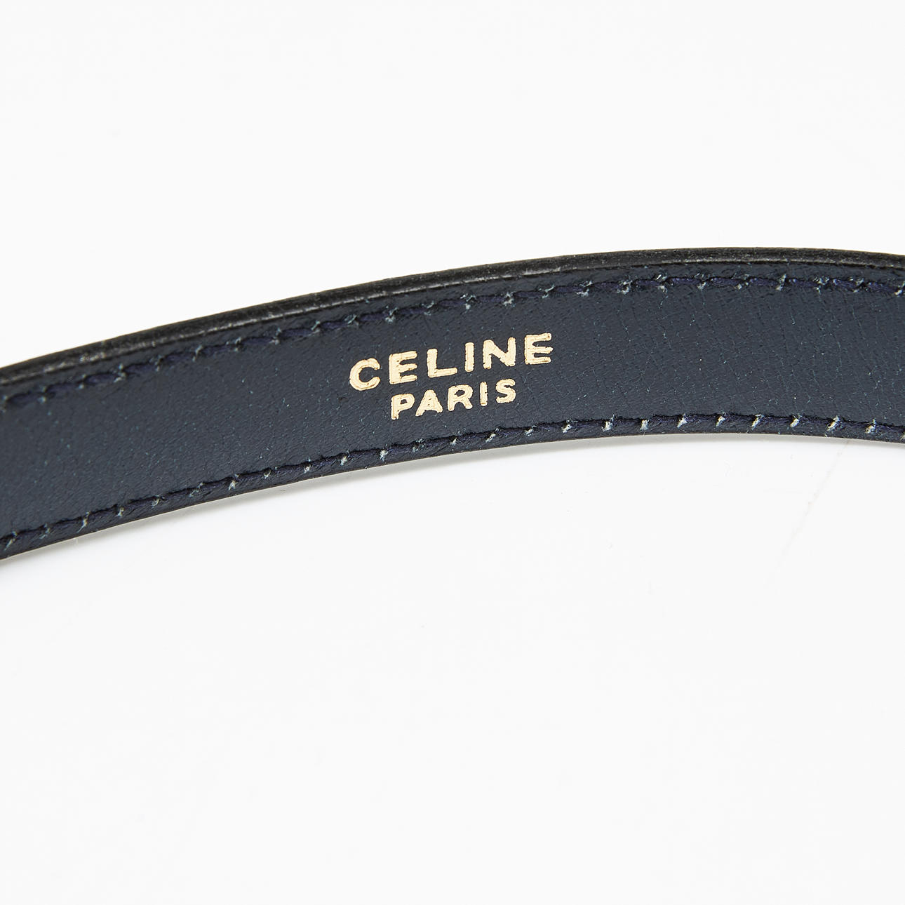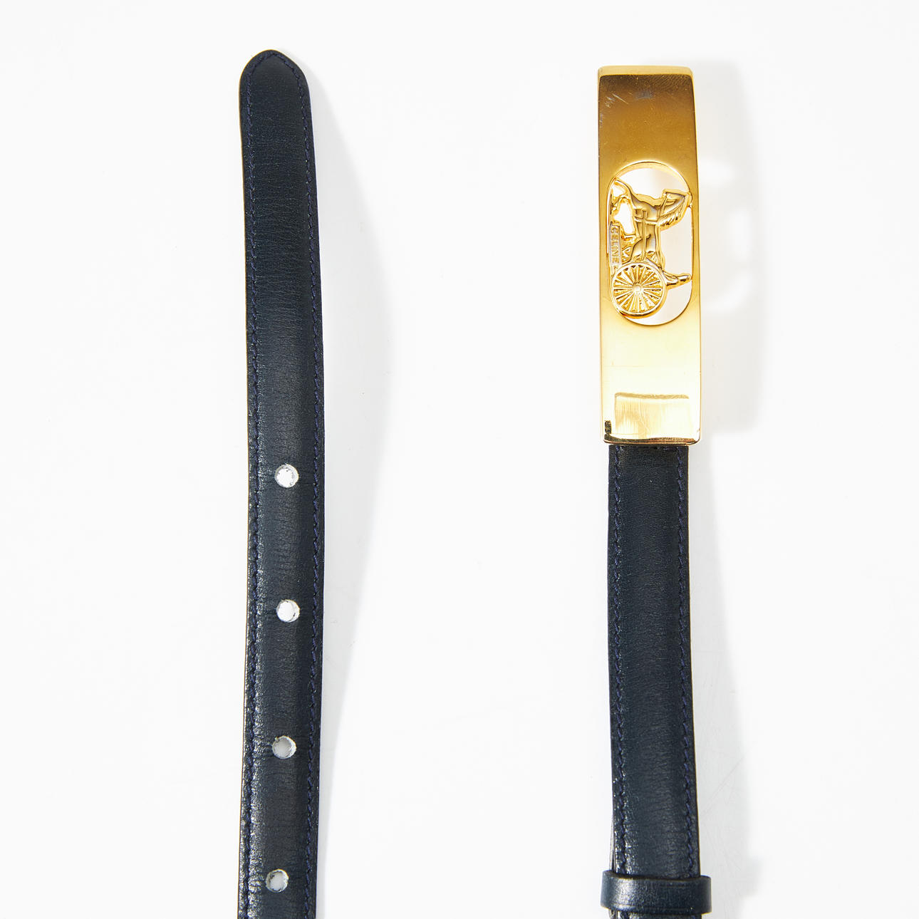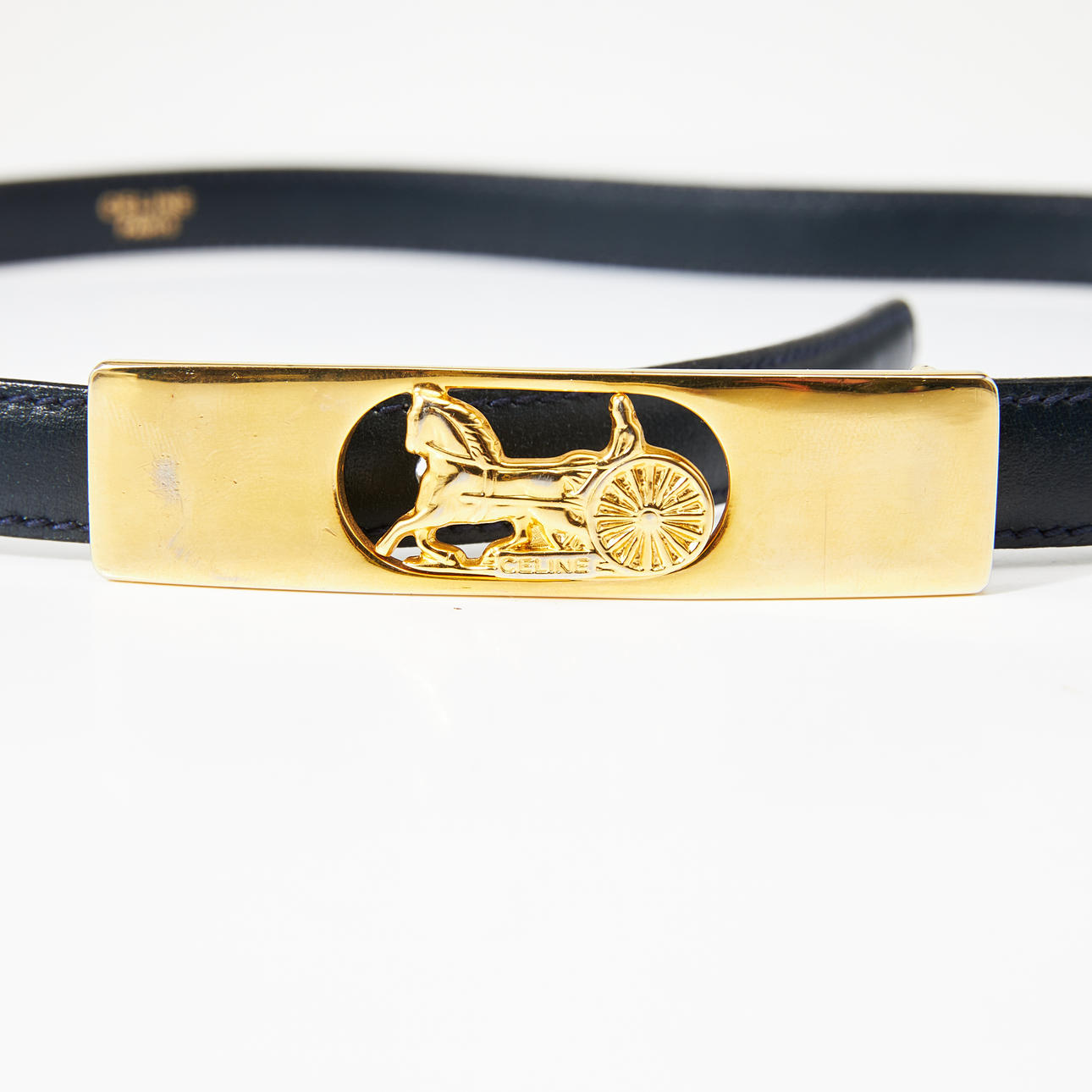 Dark blue leather belt, buckle in yellow metal with rider logo, size 70 according to marking, marked “Celine Paris”, total length approx. 87, height 2 cm.