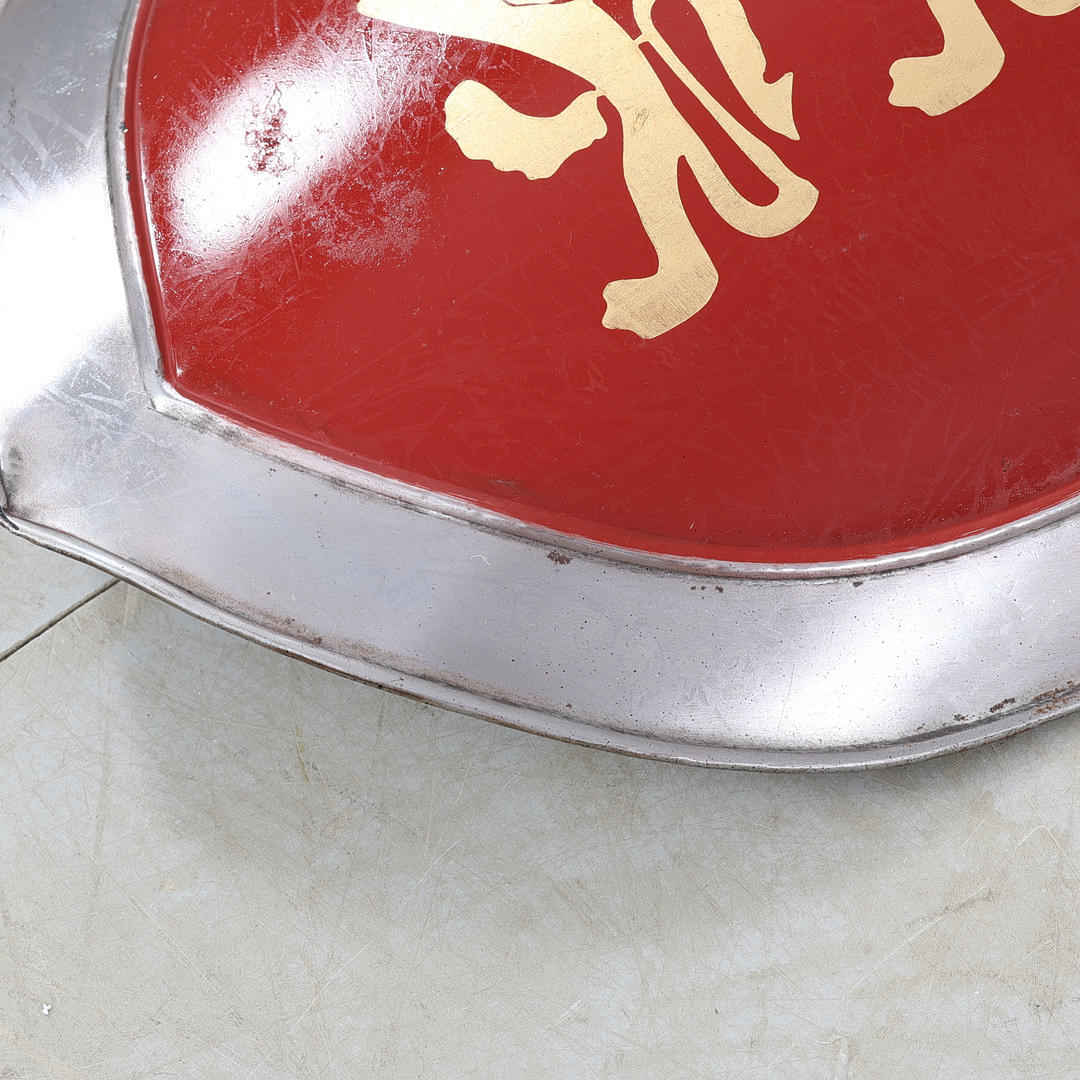 A contemporary replica of a medieval shield, with decoration consisting of three lions in gold color on a red background, framed by silver-colored metal.