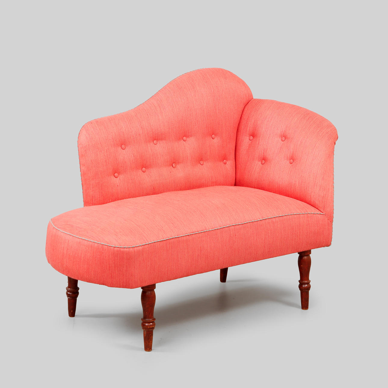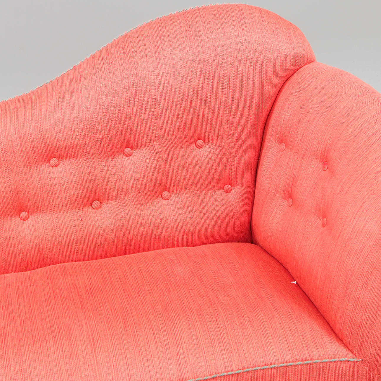 Textile upholstered, on turned legs. Length approx. 130 cm, seat height approx. 47 cm, back height approx. 93 cm.