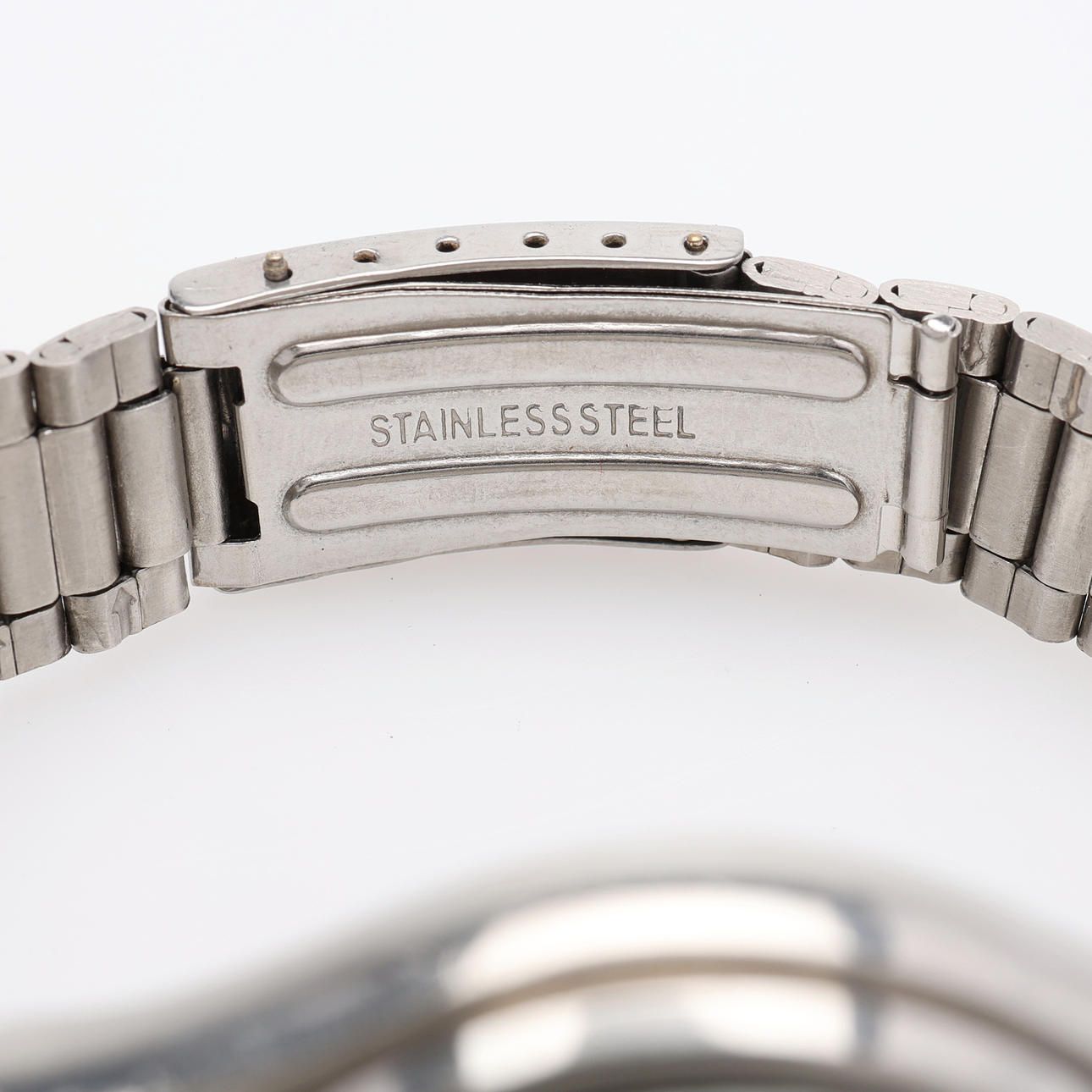 Normal wear and tear. The watch was working at the time of cataloging but needs to be reviewed, the crown is sluggishly screwed and cannot be pressed all the way in - thus one cannot set the day manually.