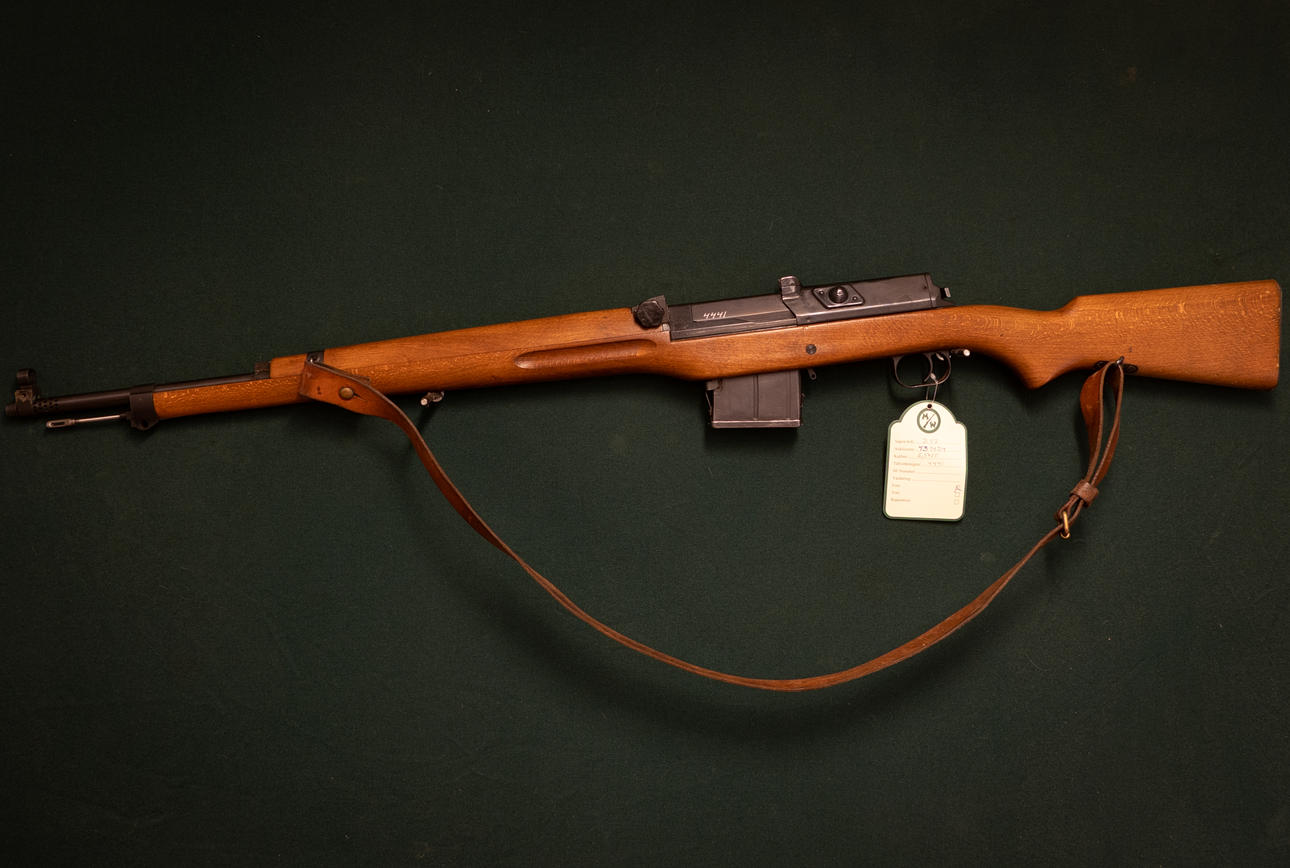 Rifle Swedish Semi-automatic Manufacture Carl Gustaf Model AG42. Caliber 6,5x55 to No. 4441. Spout length 65cm. Adjustable sight. Removable magazine. Piston with weak pistol grip.