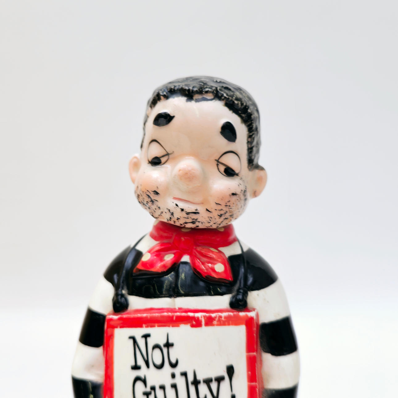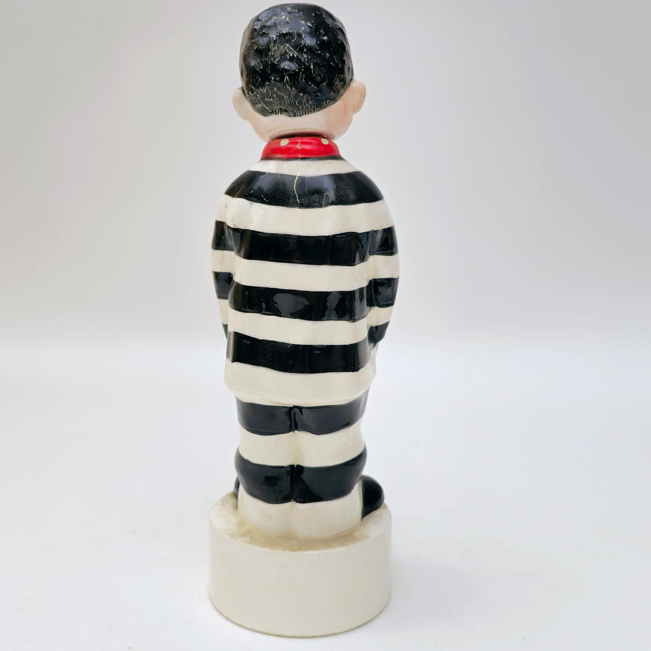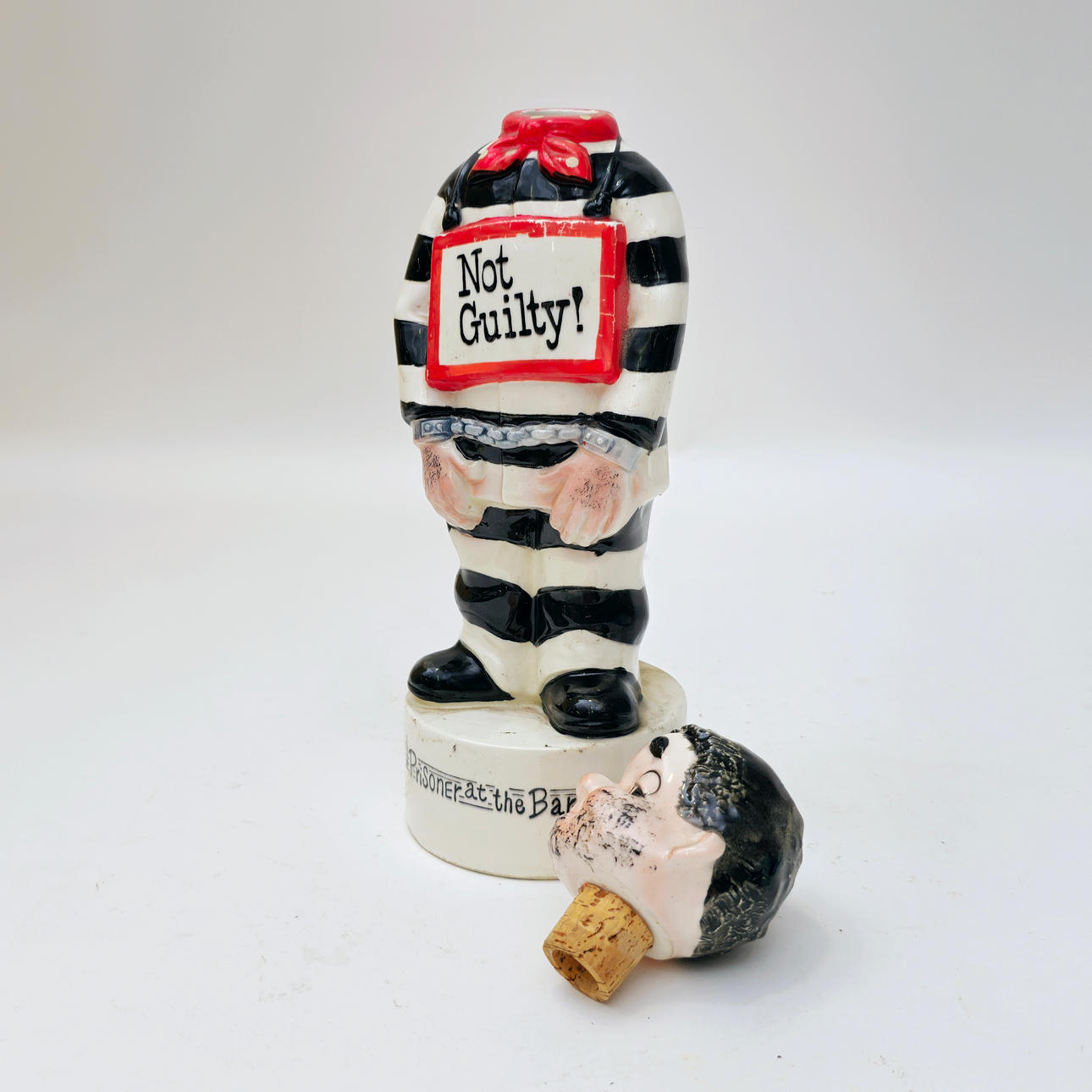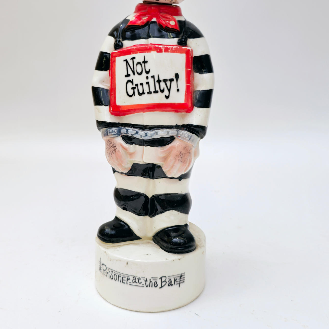 PRISONER. NOT GUILTY. MUSICAL BOTTLE. POLYCHROME CERAMIC. C. 1960S.